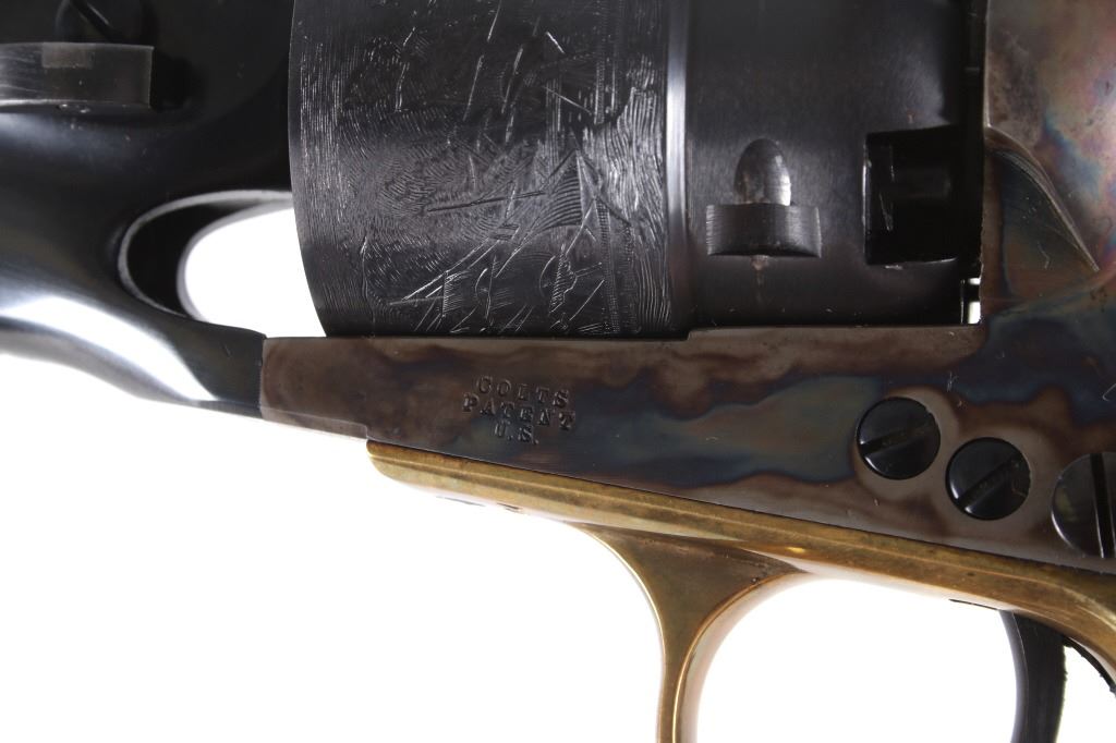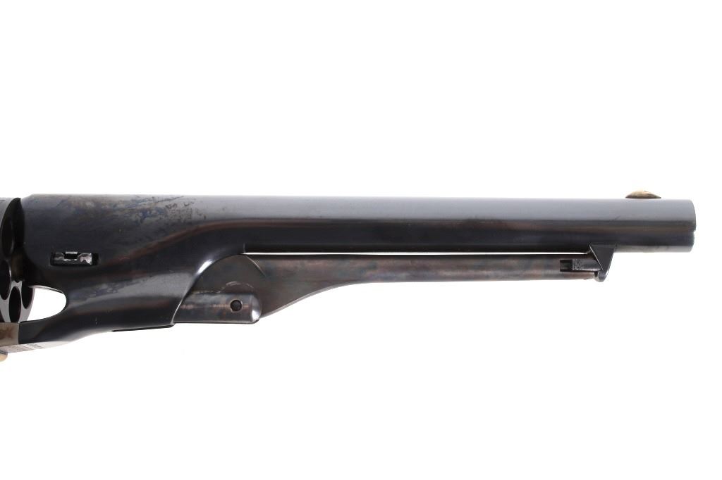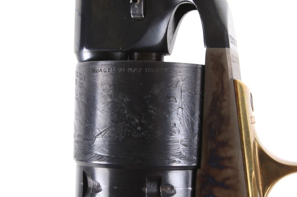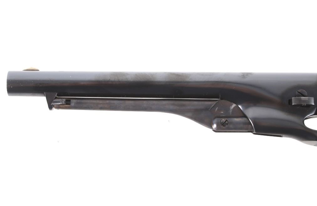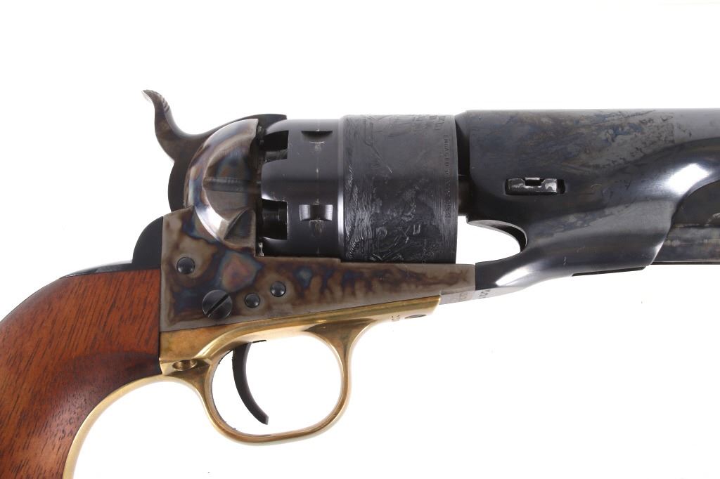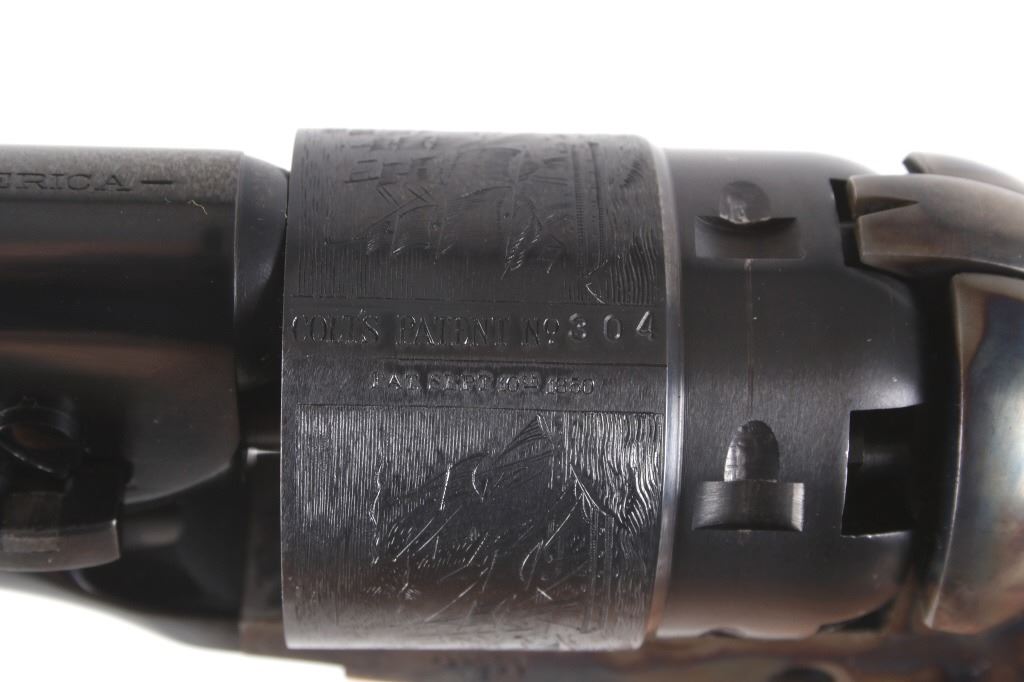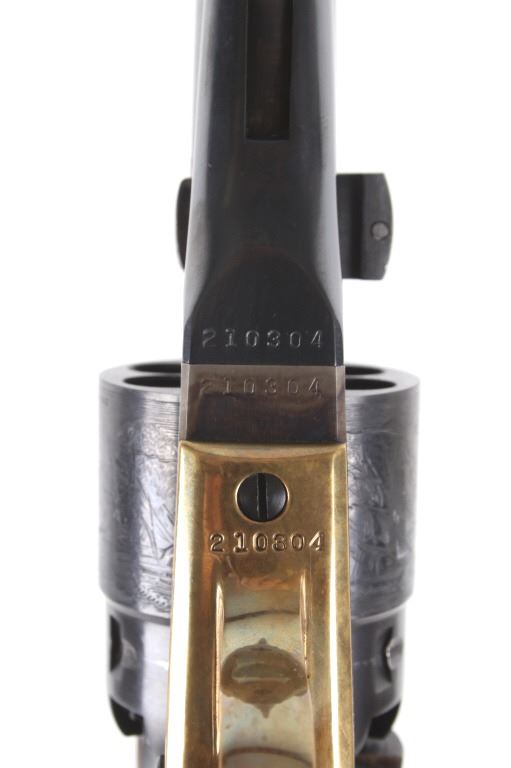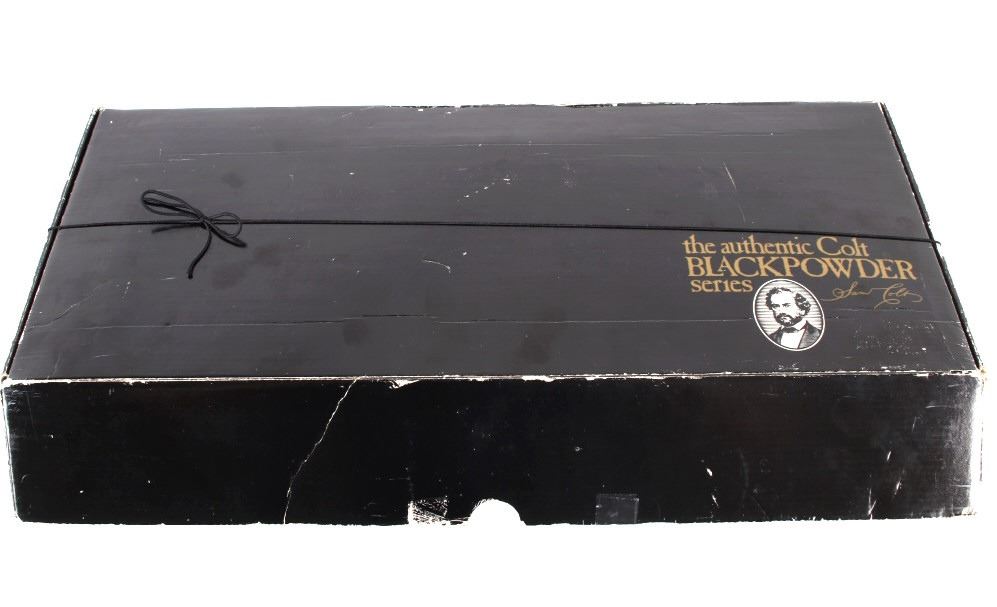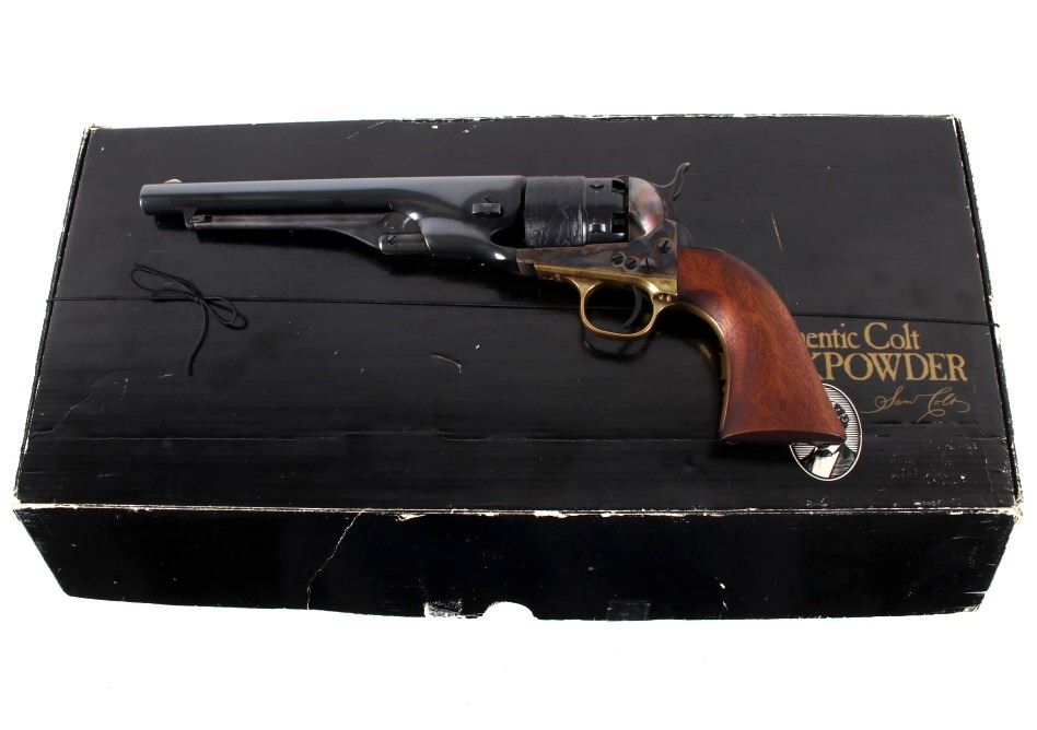 Featured in this lot is a Colt black powder series model 1860 single action Army Revolver chambered in .44 cal percussion. The revolver features an 8" barrel, 6-shot cylinder, walnut grips, brass trigger guard, brass blade front sight, and hammer notch rear sight. This was one of the most widely issued and popular revolvers of the Civil War, with many, if not most, going to the West after the war for Indian Wars or frontier service. It has matching numbers on the trigger guard, frame, and barrel. This revolver is in excellent overall condition. The cylinder displays an engraved image of sailing ships by W.L. Ormsby and the cylinder is marked "Colt's Patent No. 304 Engraved by W.L. Ormsby New York". The frame, trigger guard, and barrel are marked with matching serial numbers and come with the original box. The revolver displays wonderful condition with tight mechanics and blue'd patina. Serial Number: 210304. Colt Black Powder Series firearm manufactured by Colt in the original box, qualifies as an Antique/Black Powder pistol, but is a more modern manufacture, per the original condition and cardboard and paperwork. Colt Black Powder Series revolver in the original box.