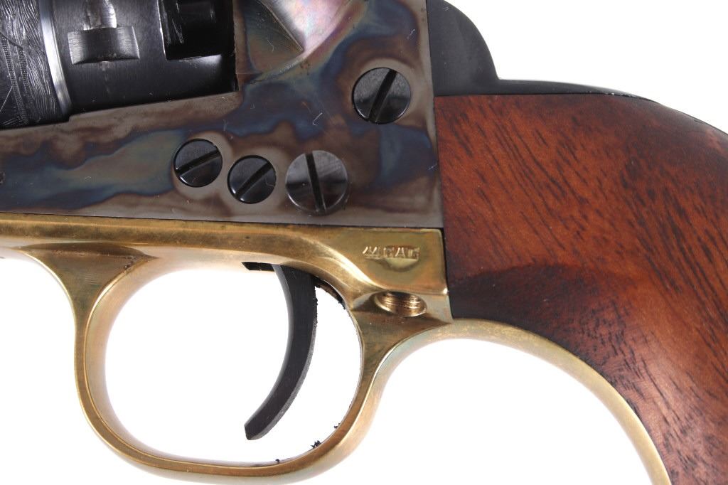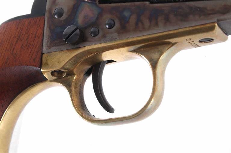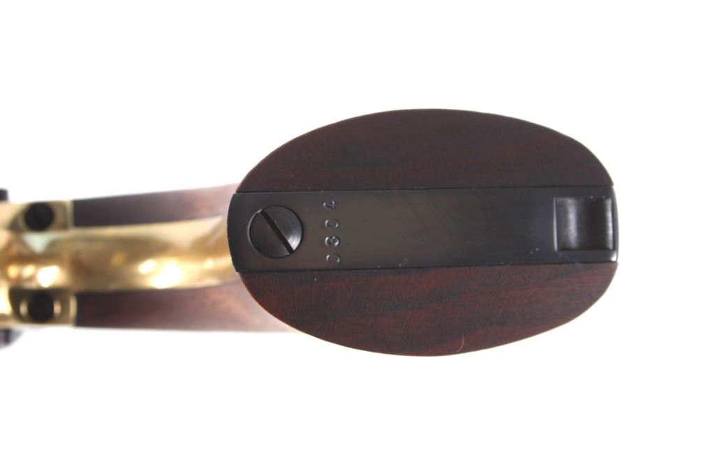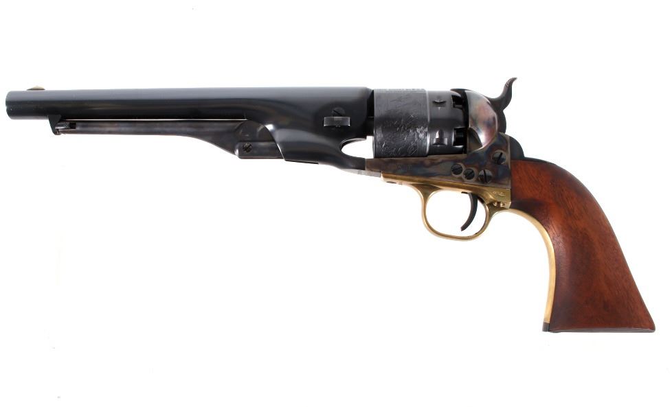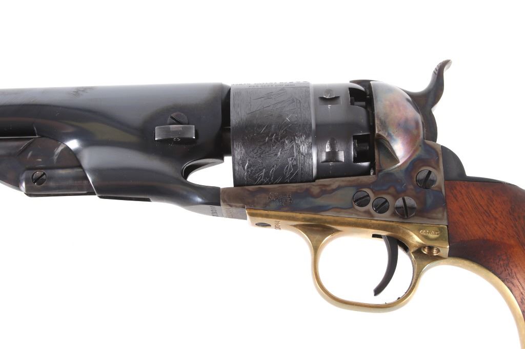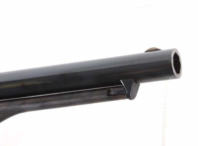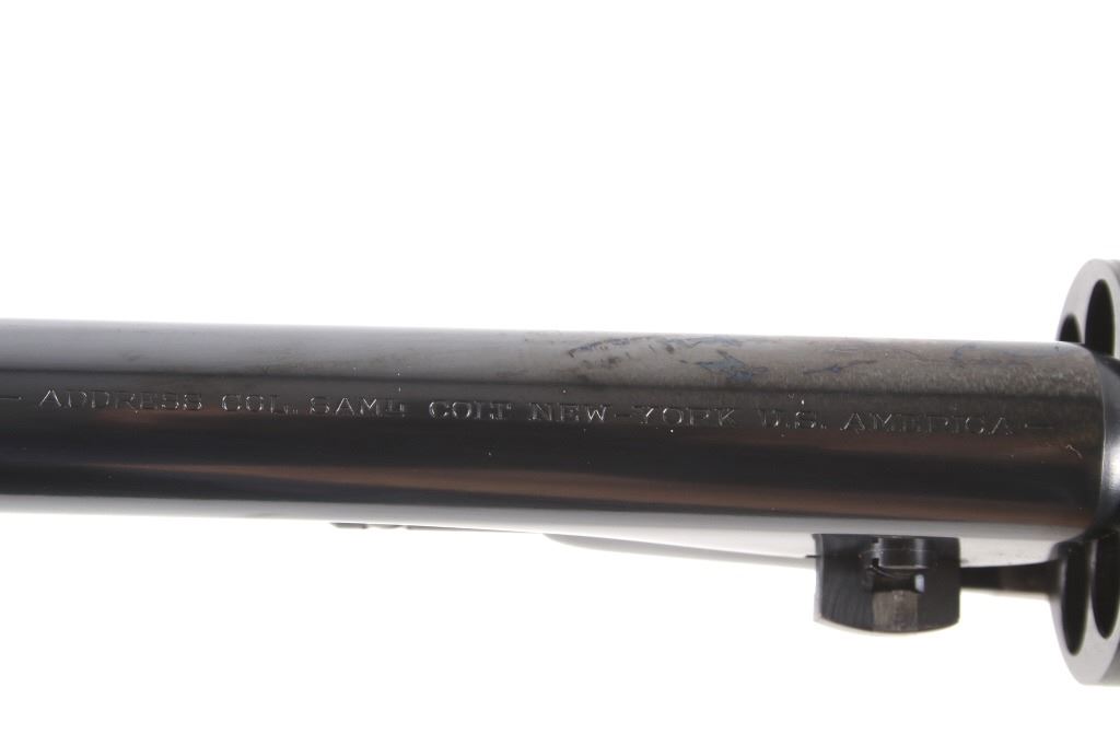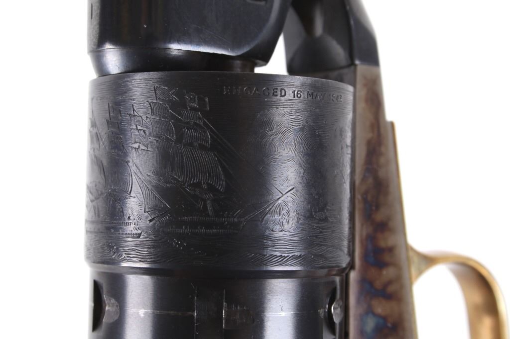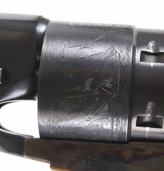 Featured in this lot is a Colt black powder series model 1860 single action Army Revolver chambered in .44 cal percussion. The revolver features an 8" barrel, 6-shot cylinder, walnut grips, brass trigger guard, brass blade front sight, and hammer notch rear sight. This was one of the most widely issued and popular revolvers of the Civil War, with many, if not most, going to the West after the war for Indian Wars or frontier service. It has matching numbers on the trigger guard, frame, and barrel. This revolver is in excellent overall condition. The cylinder displays an engraved image of sailing ships by W.L. Ormsby and the cylinder is marked "Colt's Patent No. 304 Engraved by W.L. Ormsby New York". The frame, trigger guard, and barrel are marked with matching serial numbers and come with the original box. The revolver displays wonderful condition with tight mechanics and blue'd patina. Serial Number: 210304. Colt Black Powder Series firearm manufactured by Colt in the original box, qualifies as an Antique/Black Powder pistol, but is a more modern manufacture, per the original condition and cardboard and paperwork. Colt Black Powder Series revolver in the original box.