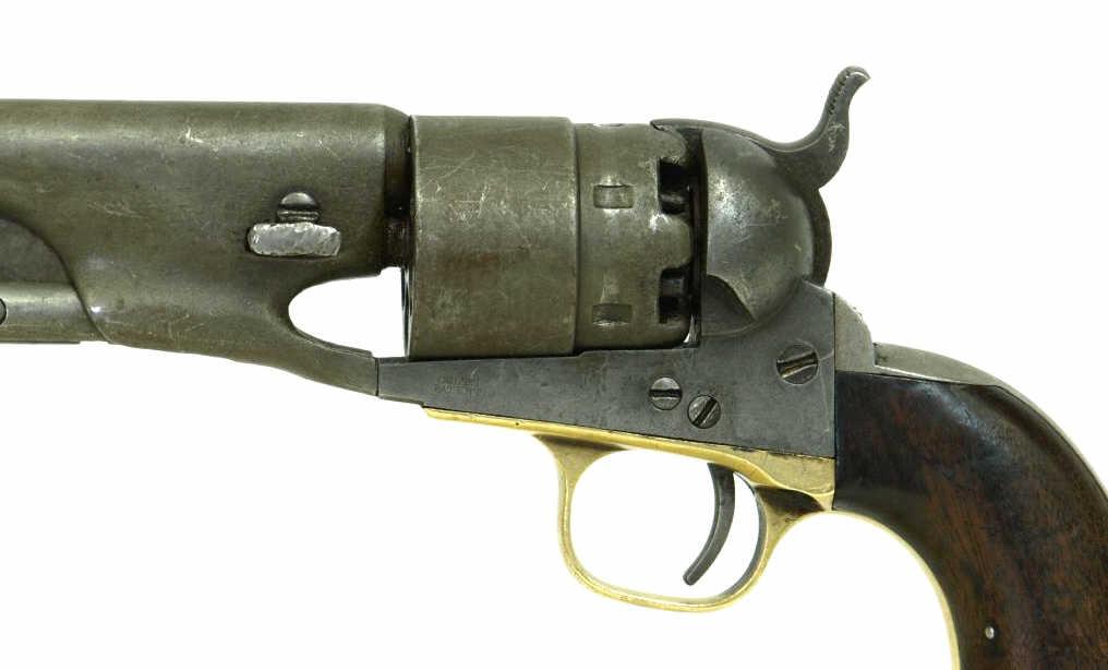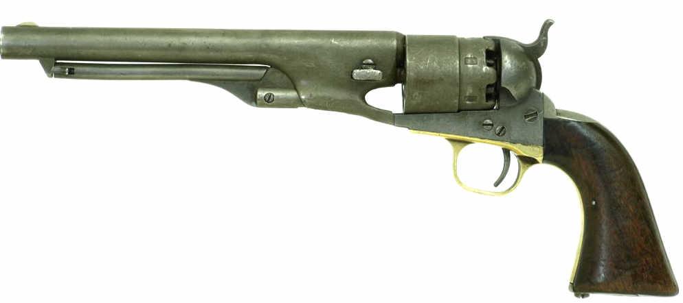 revolver with 8" barrel and walnut grips. Revolver shows crisp markings, gray finish beginning to turn brown, all matching visible serial numbers including cylinder. Walnut grips remain in fair to good condition with visible cartouche to both sides and slotted for shoulder stock. Functioning action with fairly good bore. Manufactured in 1863, NO FFL required.