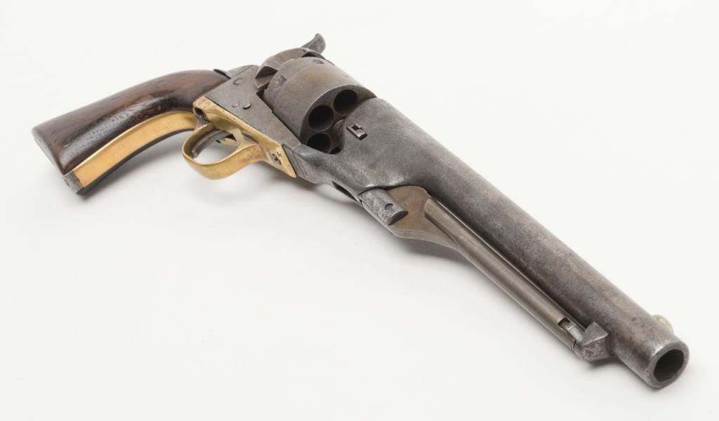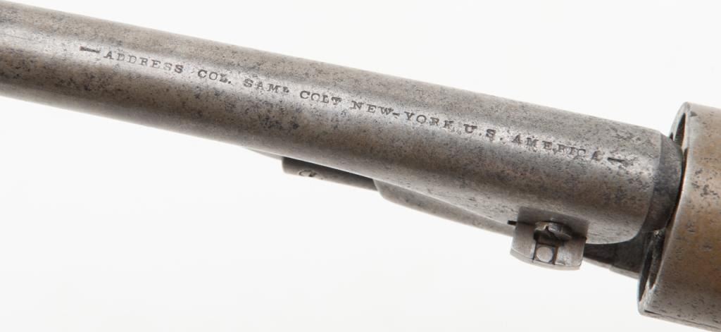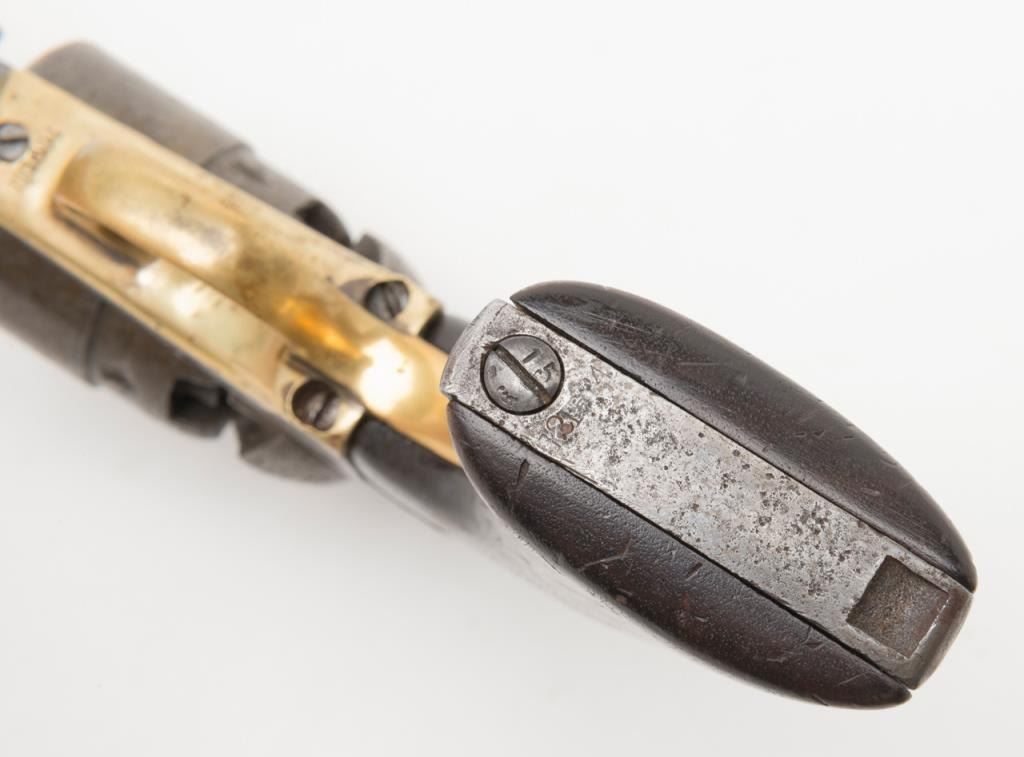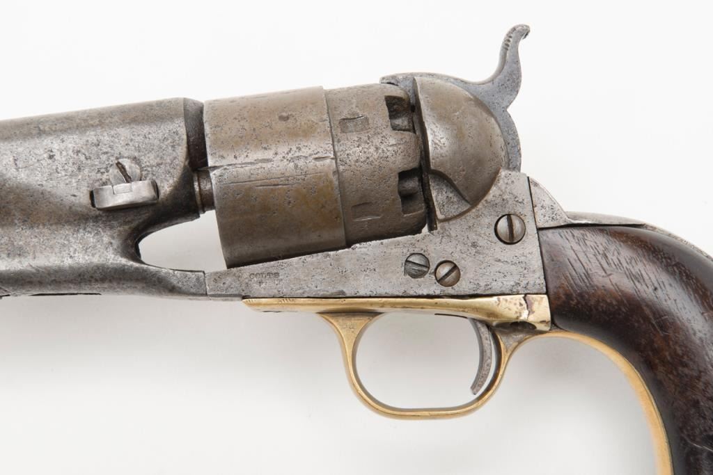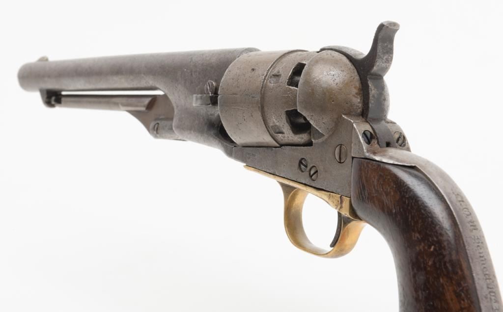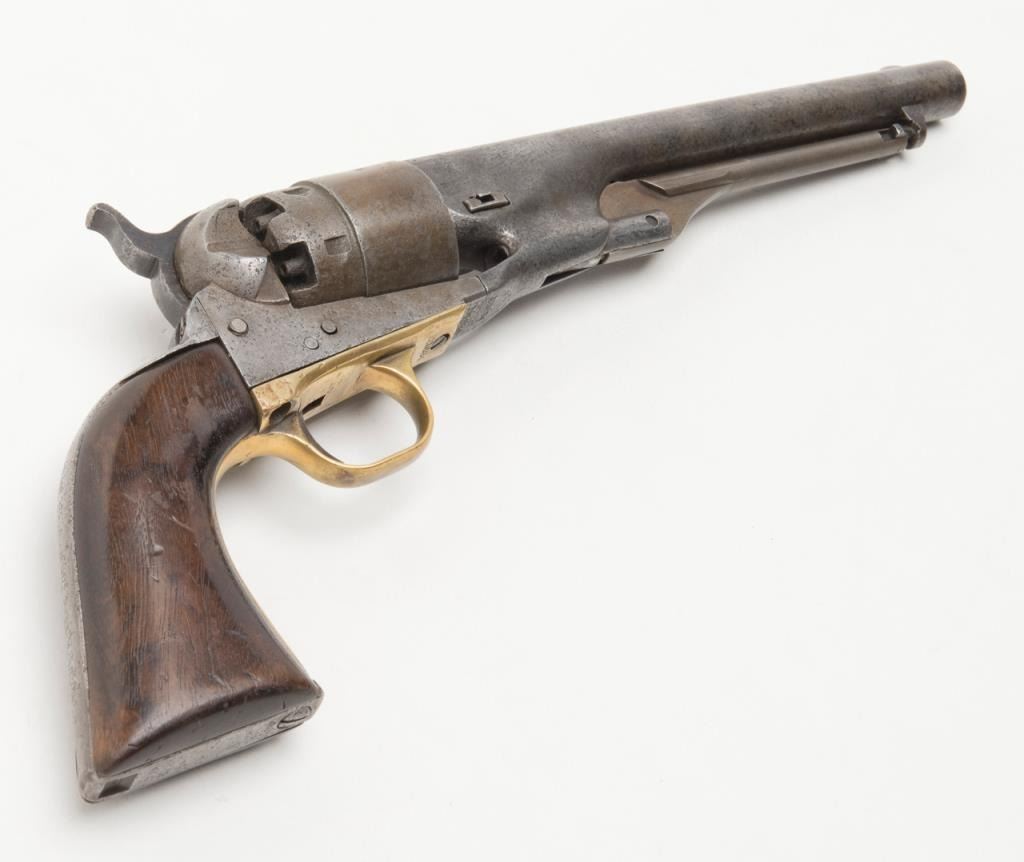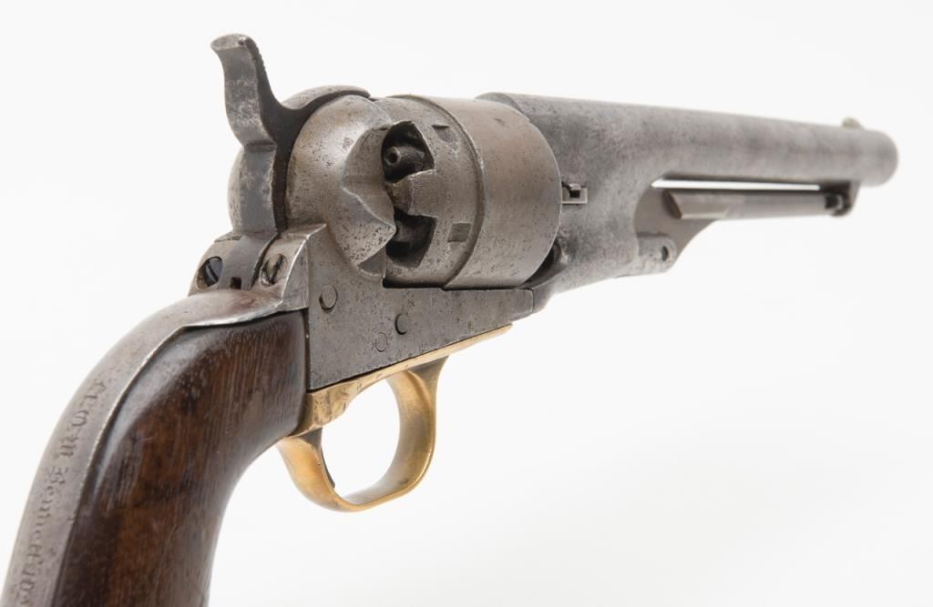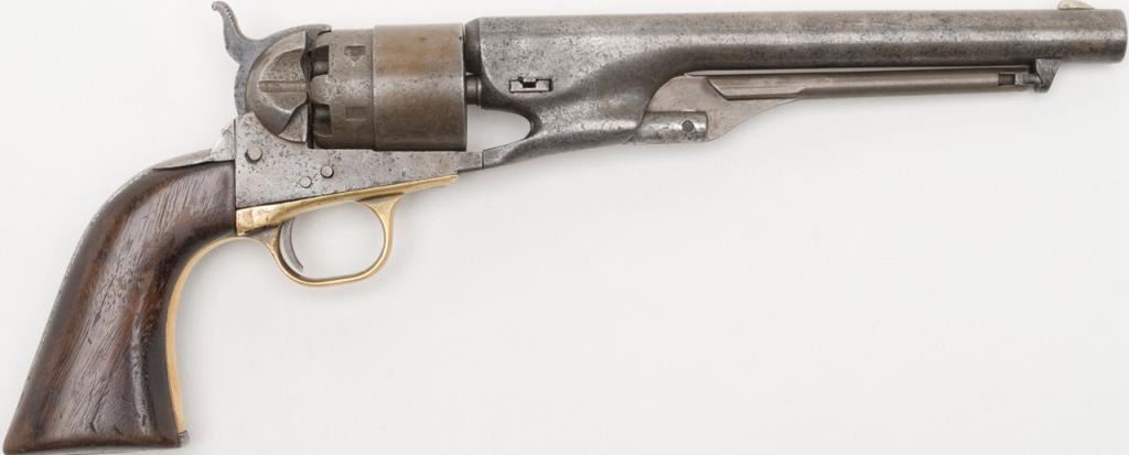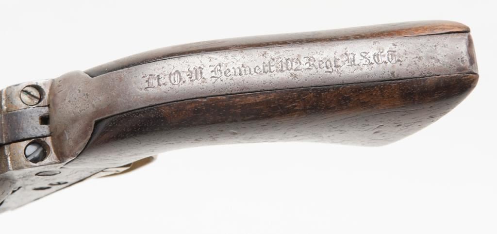 stock percussion revolver, .44 cal., 8” barrel, grey patina, wood grips, #121684, inscribed on backstrap “Lt. O. W. Bennett 102nd Regt U.S.C.C.”. This gun is in well-used but overall good condition showing a general grey patina with scattered pinprick pitting on metal surfaces, working action, dark bore and overall good grips that have been thinned down and re-finished, likely some time ago. Service record of Lt. Bennett should be research. (Antique). Est.: $1,400-2,800