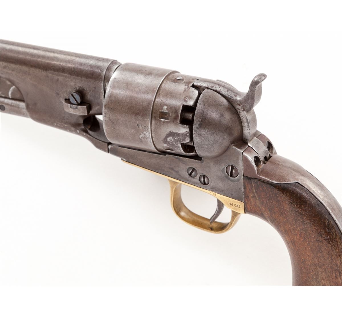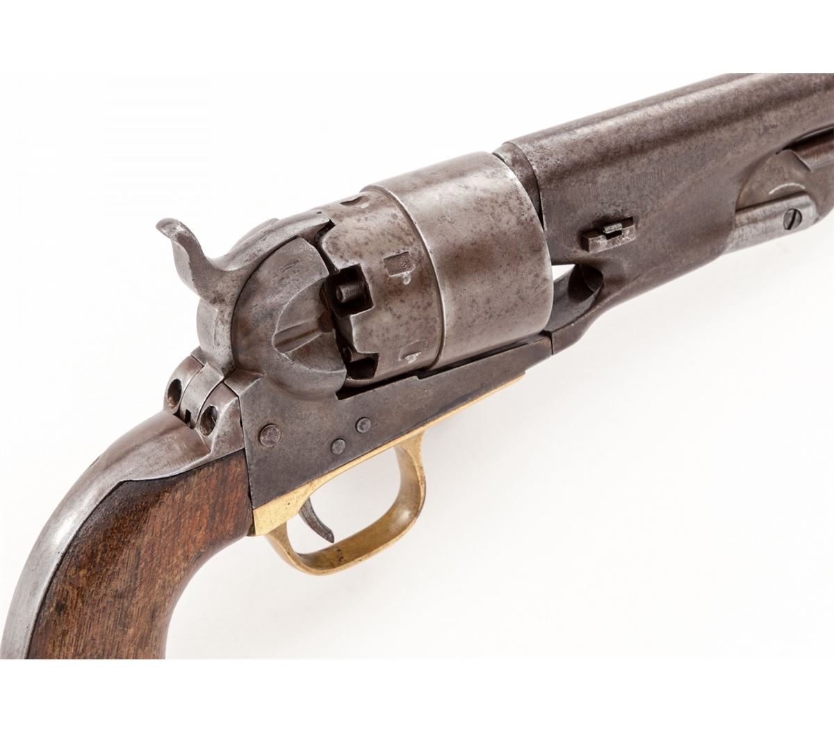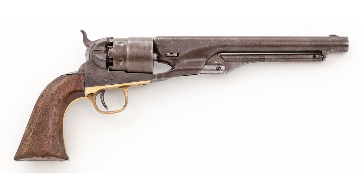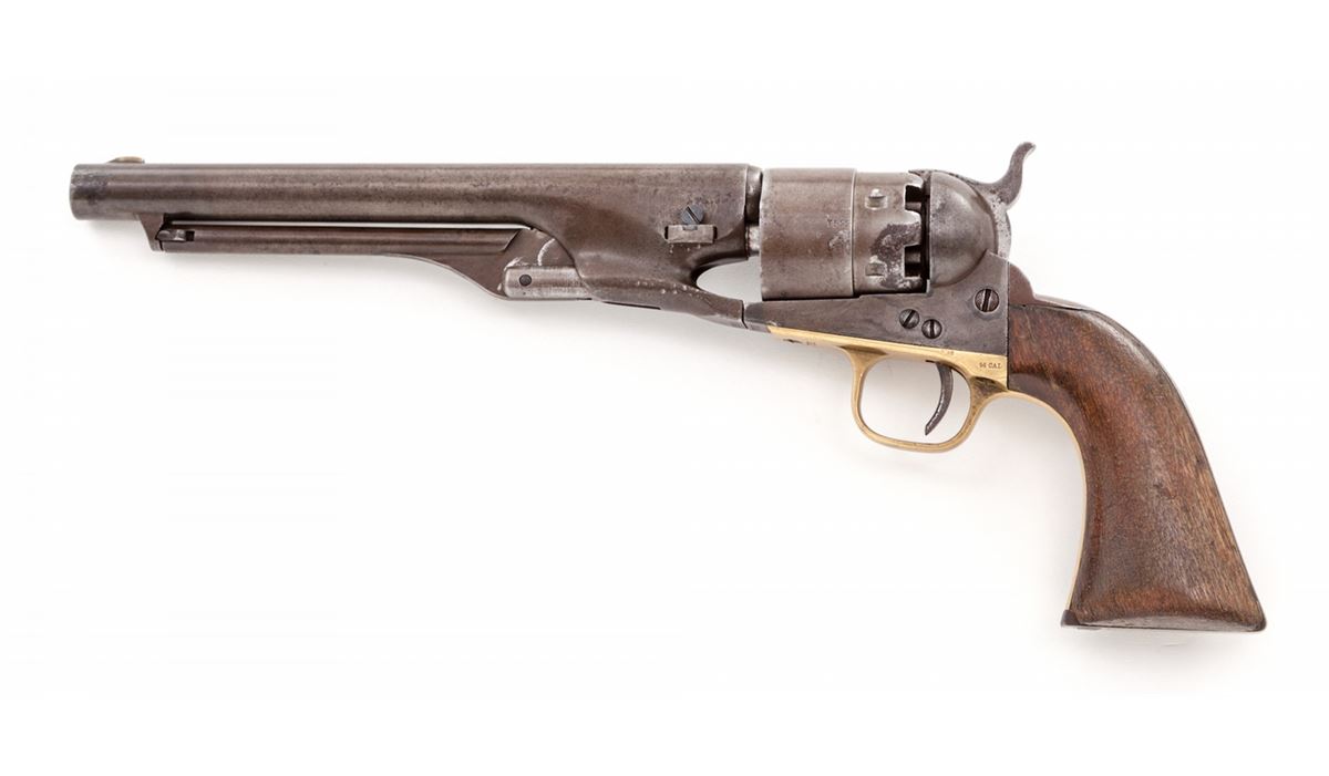 Colt Model 1860 Army Percussion Revolver, #167522, .44 ball, 8'' barrel, originally blue and case hardened finish, iron backstrap and brass triggerguard, with one-piece walnut grips. Mfg'd 1867. Condition is fine retaining approx. 30% finish that has thinned and toned. Grips show light water damage and one repaired crack to right side. All visible matching serial numbers including wedge; wedge screw appears to be a replacement. Action is crisp, bore is fair. Est.: $1,500-$2,000. (Antique)