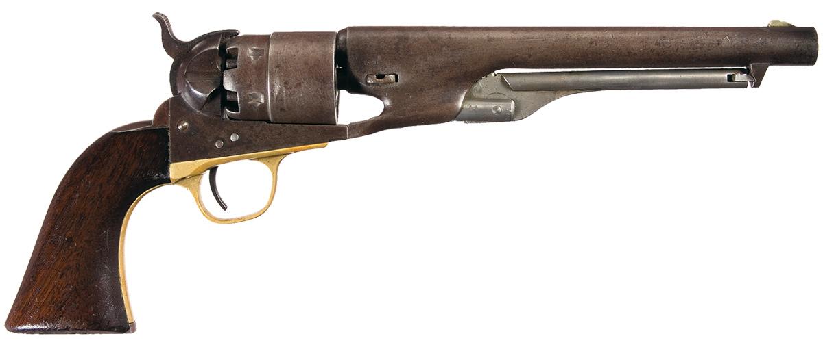 Manufactured in 1863. Three screw frame cut for a shoulder stock. Silver blade sight on a barrel marked "-- ADDRESS COL. SAML COLT NEW-YORK U. S. AMERICA --" . The left side of the frame is marked "COLTS / PATENT", "44 CAL" on the left side of trigger guard, and the Texas navy scene is rolled engraved on the cylinder. Inspection marks are stamped on the barrel, cylinder, and grip straps. Matching number on barrel, frame, cylinder, trigger guard, and backstrap with mismatched wedge. Smooth grip with no visible cartouches.