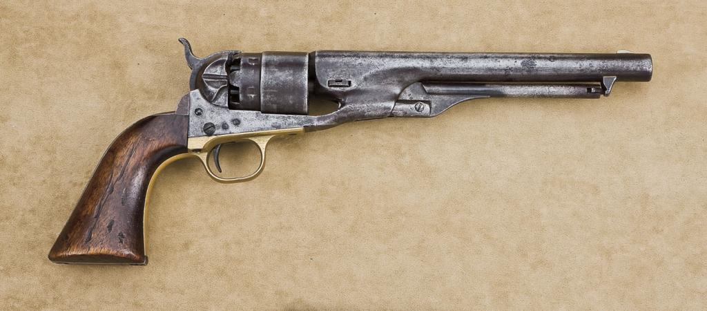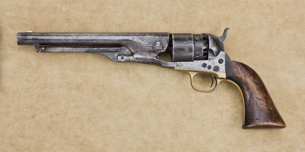 Colt Model 1860 Army Revolver .44 cal., percussion , patina finish, wood grips, 4 screw frame with copy of factory letter stating: shipped to Governor Morton, Indianapolis Indiana April 21, 1861 one of 400 in shipment, serial #21981. Oliver Hazard Perry Throck Morton was a staunch ally of Abraham Lincoln and a devoted Unionist. He exceeded his authority by calling out the Militia and stifling the Democrats in the Indiana General Assembly. He arrested his enemies and suspected Southern Sympathizers. He had a long and vibrant Political Career and died while serving in the Senate in 1877. Morton equipped the Indian State Militia with this and the other 399 Colt Armies which were well used by the Gallant Indiana Troops which saw action from 61 throughout the Civil War. The Army remains in original good condition showing a dark grey to brown patina finish. The barrel address is good, the cylinder shows only faint hints of scene, the patent mark on frame is visible, the grips show carry and wear with some scrapes and battle sores but are fair-good and sound. There is some light to moderate pitting and erosion and the pistol has seen carry and field use. There are scratches and dings especially on the cylinder and the nipples are very old replacements (almost undetectable). The action is tight and the bore is still good. All matching visible numbers (the number on the cylinder is not legible) but this cylinder has been in this Colt all it's working life. Est. $1,750-3,500