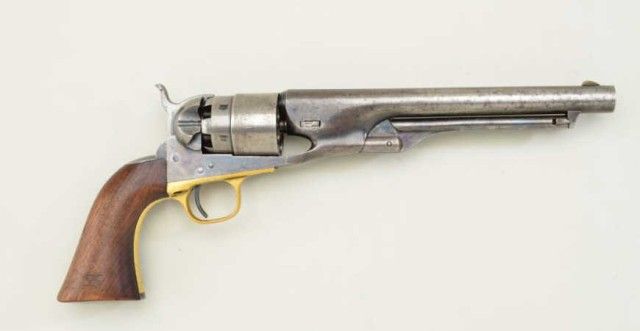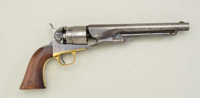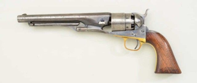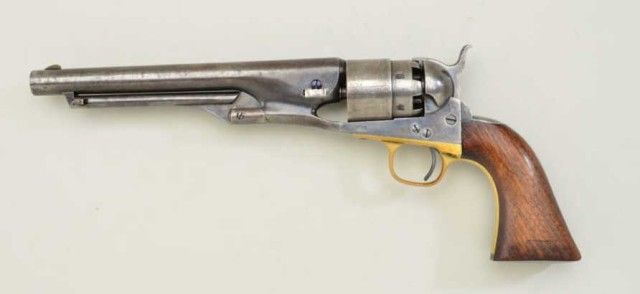 Colt Model 1860 Army percussion revolver, .44 cal., 8” barrel, blue and case hardened finish, wood grips, martially inspected, #45134. This early ’60 Army is in overall fine condition showing approx. 20% originalblue, mostly in protected areas, approx. 80% original case colors on frame and loading lever, crisp cylinder scene with sharp engagement date, fine bore, crisp action, iron backstrap with nice patina on brasstrigger guard; fine wood grips showing the majority of both inspector cartouches and “H” inspector mark on bottom of left grip; a really sharp Civil War era martial Army manufactured circa 1862. Est.:$2,500-$5,000.