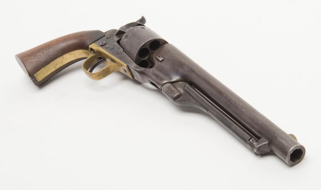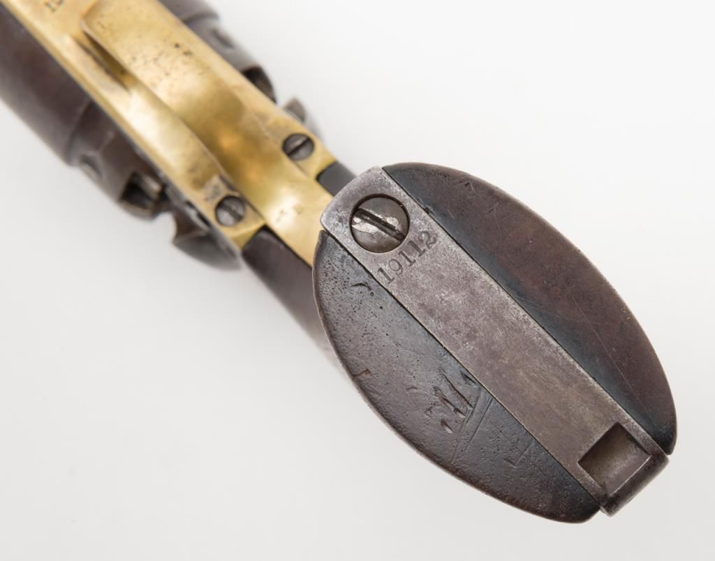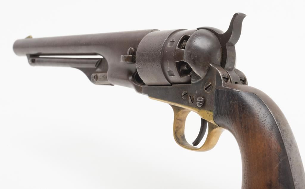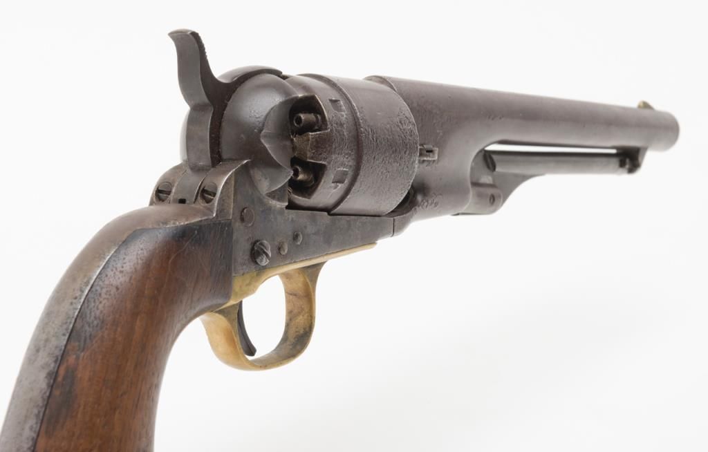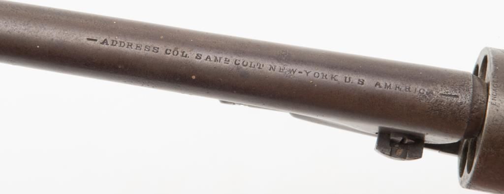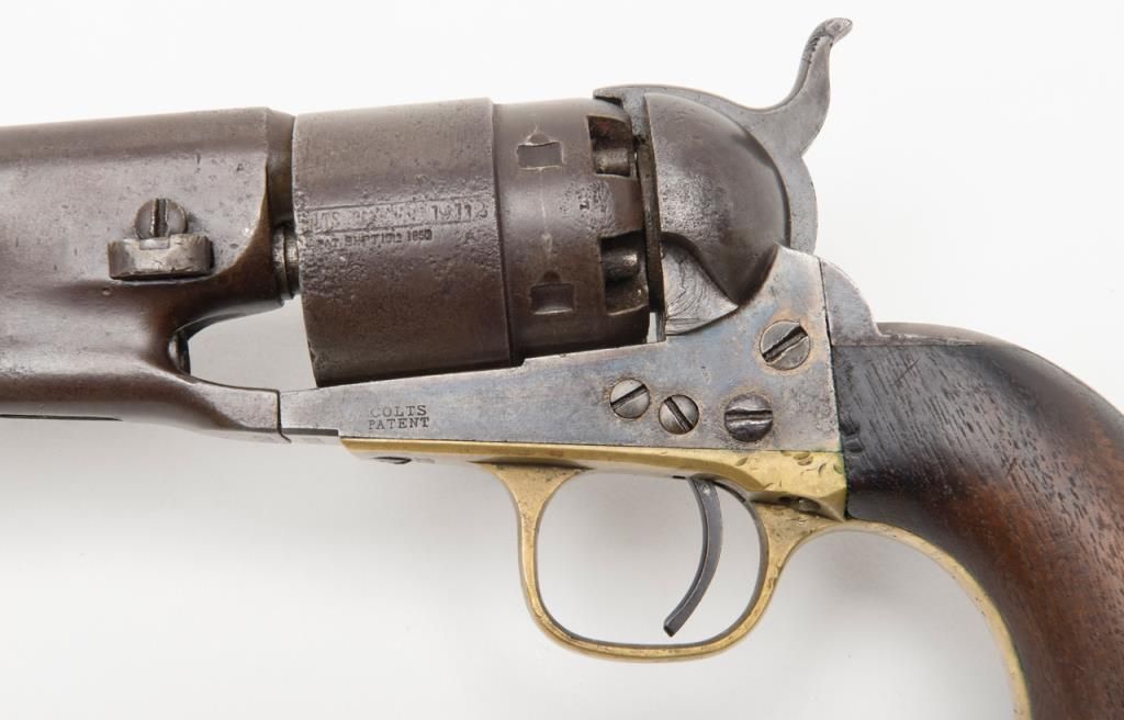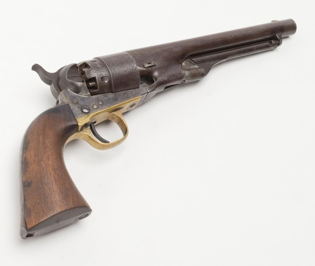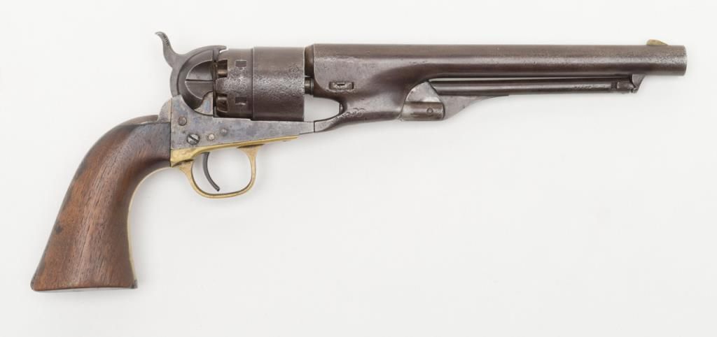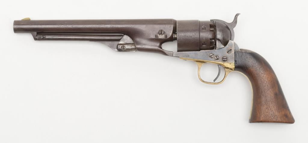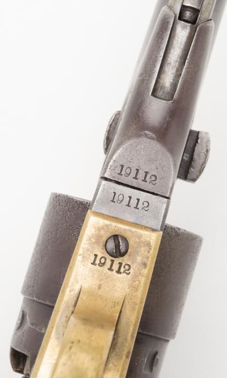 Colt Model 1860 Army percussion revolver, .44 cal., 8” barrel, blue and case hardened finish, wood grips, #19112 in overall good condition showing a dark patina on metal surfaces, pitting on a portion of the cylinder, matching visiblenumbers, traces of case colors on the frame, action working, good markings and good grips with partially visible cartouche on left grip; an early 4 screw ’60 Army cut for shoulder stock that is un-cleaned and the way collectors love to findthem! (Antique). Est.: $800-$1,600.