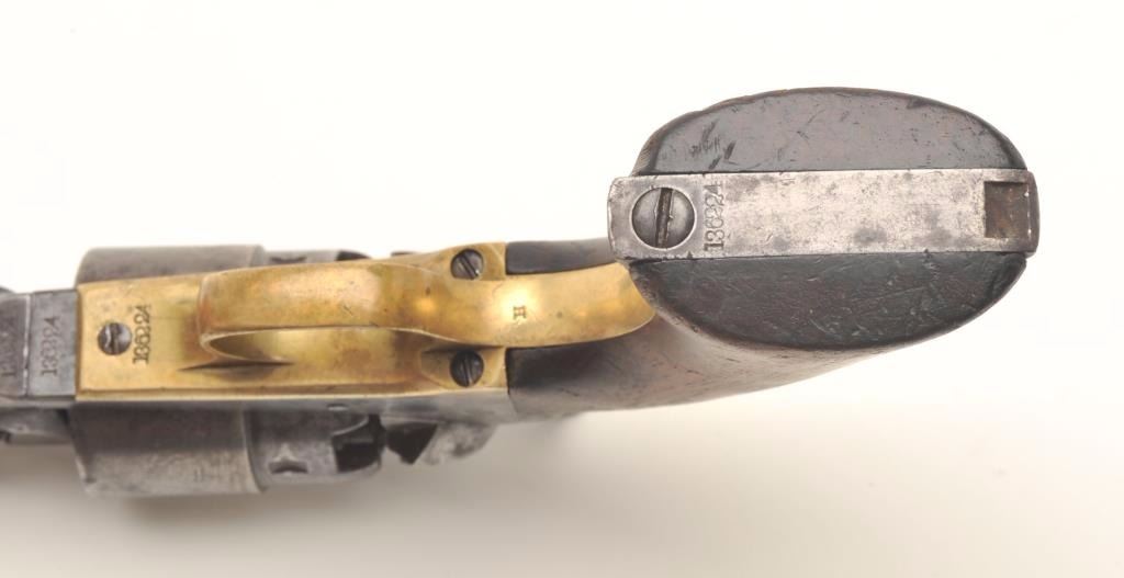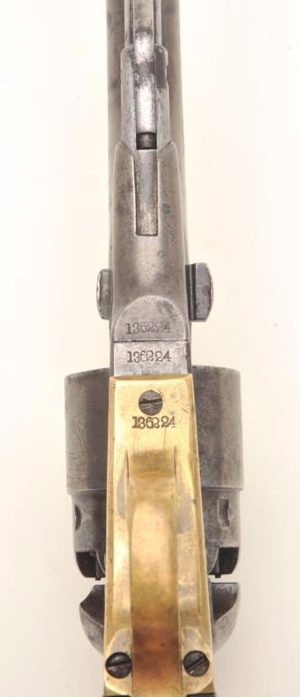 Colt Model 1860 Army percussion revolver, .44 caliber, 8” barrel, blued and case hardened finish, wood grips, S/N 136224 (all matching visible numbers), in overall good to very good condition with some scattered areas oferosion, crisp action, sharp markings, majority of original cylinder scene and cylinder stop pins remaining, very good grips with both inspector’s cartouches mostly visible. (Antique). Est.:$1,600-$2,400.