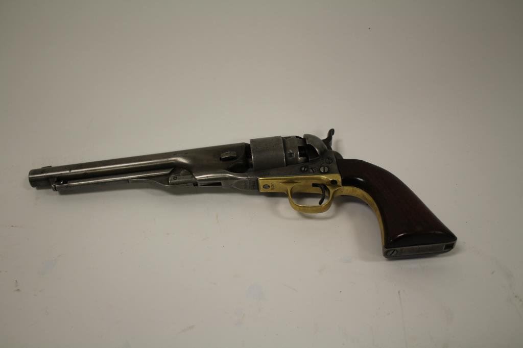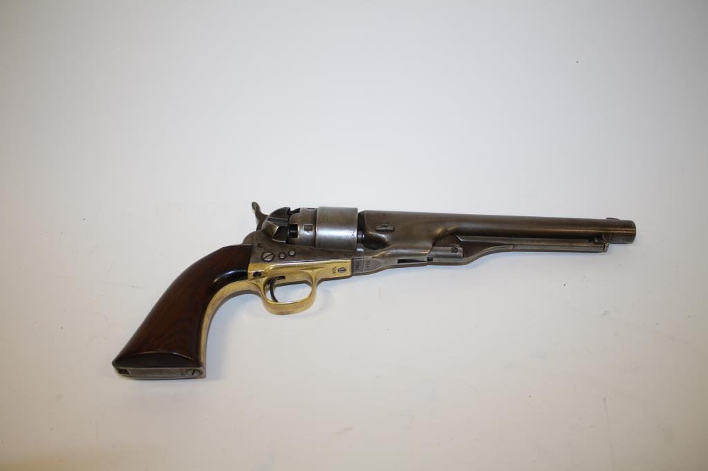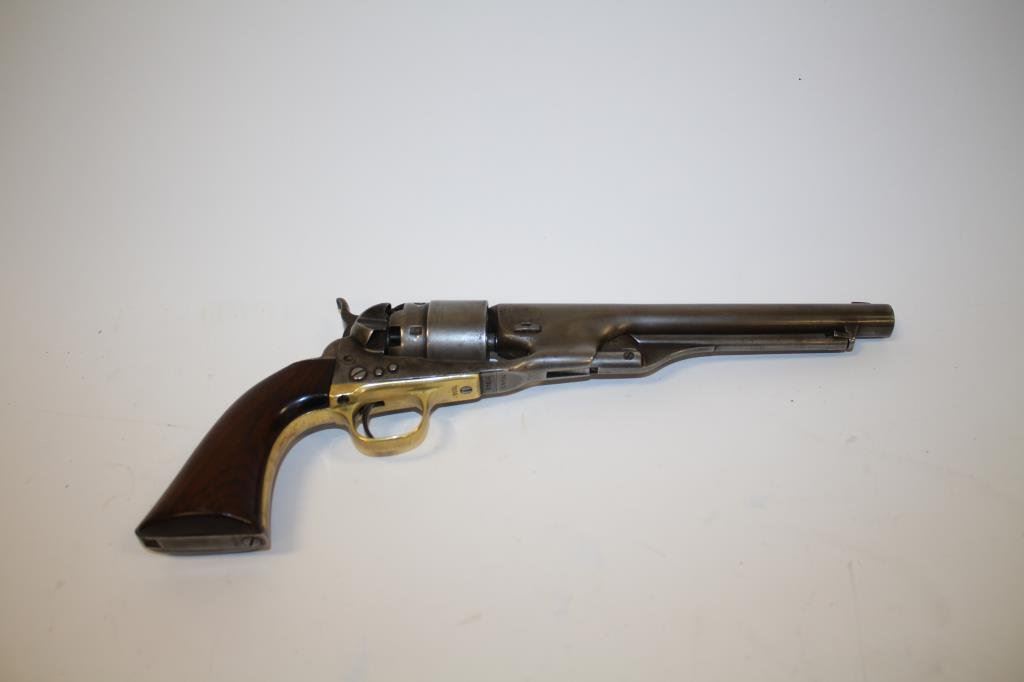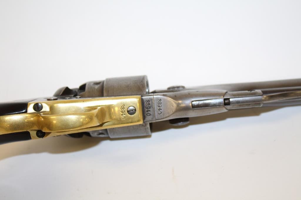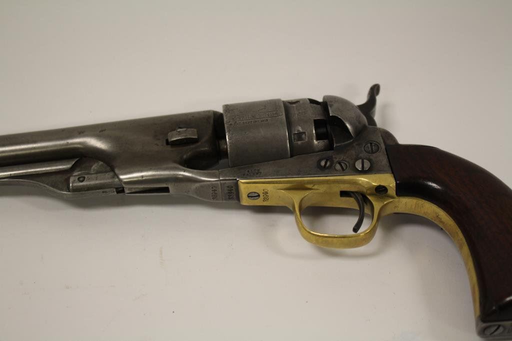 wood grips, S/N 33940 (all matching visible numbers), grey patina to metal surfaces; overall good condition with a good action, traces of original cylinder scene, good grips with sign of a light re-finishing. (Antique). Est.: $800-$1,600.