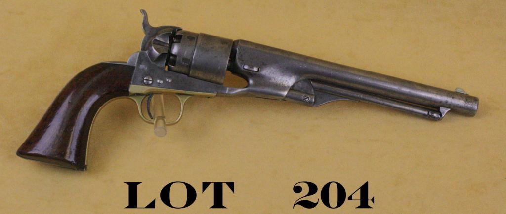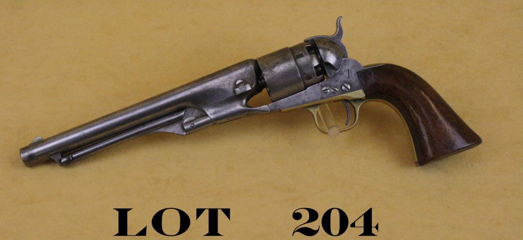 Colt Model 1860 Army percussion revolver, four screw variation, .44 cal., 8” barrel, wood grips, #7551. This gun is in overall good condition showing a light gray patina on metal surfaces, all matching visible serialnumbers, traces of cylinder scene, fair + bore, good action, good grips that have an old re-varnish. Est.: $1,500-$2,250.
