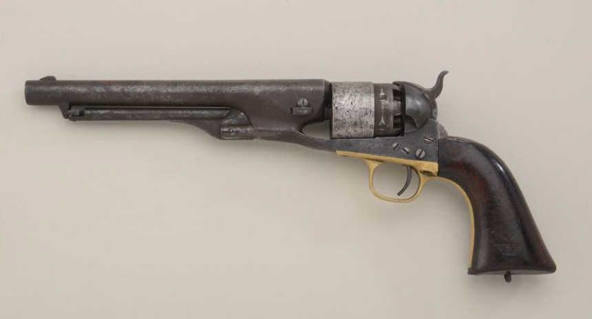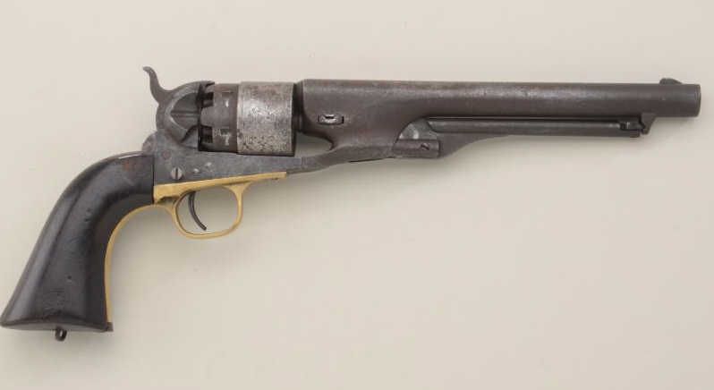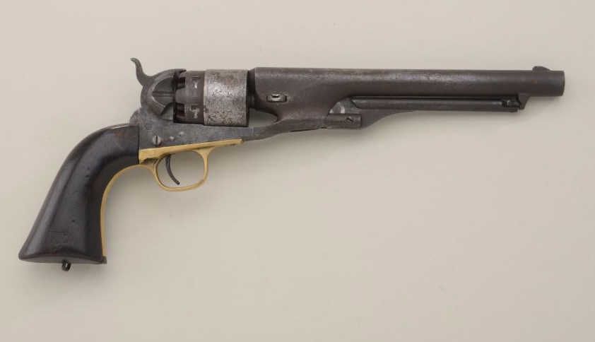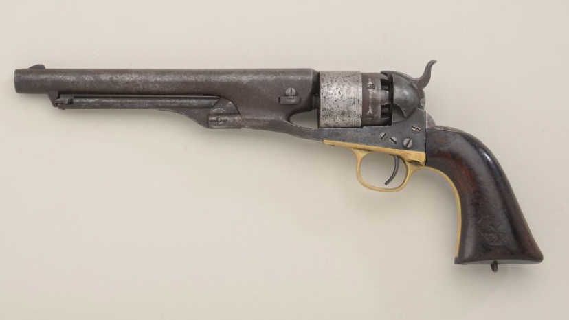 Colt Model 1860 Army revolver .44 cal. percussion, 4-screw frame, martially marked, serial #34126. The bottom of the grip shows a simple metal lanyard of the type often favored in the South. The metal surfacesshow a brown patina finish with light to slightly heavy scattered erosion and pitting. The barrel address, patent markings are visible and there is a trace of scene. There has been some light cleaning, mostly on thecylinder, long ago. The grips are very good showing some marks from attachment of stock, minor scratches, 2 sharp cartouches, B H, left and right. All matching visible serial numbers, action good, interior good. Therevolver has seen moisture and damage to finish from being carried in the holster. Est.: $1,400-$2,800