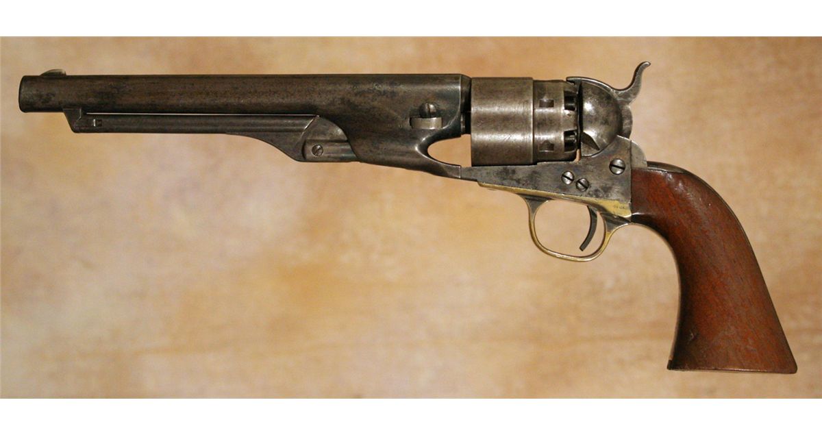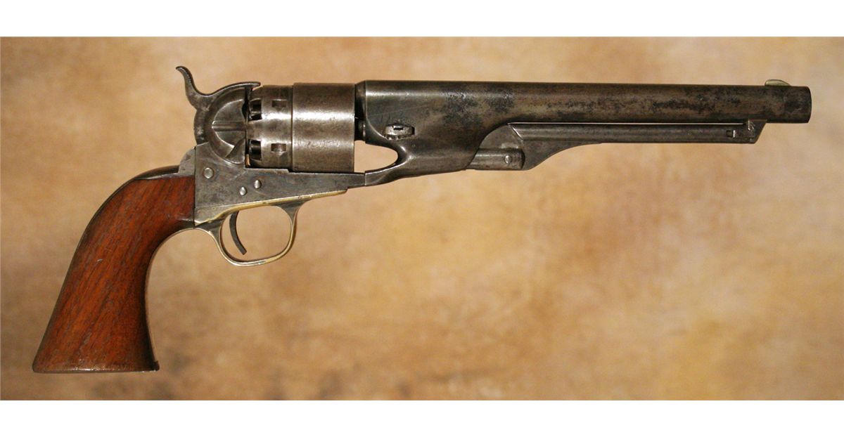 Colt Model 1860 Percussion Revolver. 8" barrel. Civilian model, cut for shoulder stock. Serial #146481 - all match. Fine walnut grips. Manufactured in 1863.