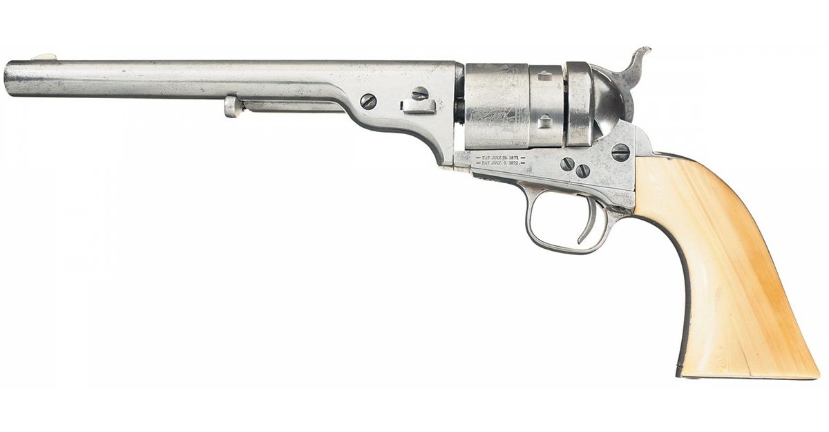 This is an example of a Colt Model 1860 Richards-Mason conversion. Total production of the Model 1860 Richards-Mason Revolvers is estimated to have been about 2,100. The Model 1860 Richards-Mason Revolver is one of the scarcest Colt cartridge conversion revolvers. The revolver has the distinctive breech plate without a rear sight and a loading gate with external spring marked "1217" and a hammer with the added centerfire pin and notch rear sight. The barrel lug is a smaller lug, much different in appearance to the standard 1860 Army lug and the slot has been filled. The top of the barrel has the one line address, two line patent dates on the left side of the frame and "44 CAL" on the left trigger guard shoulder. All of the visible serial numbers match. Fitted with a smooth one-piece ivory grip.