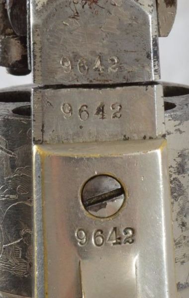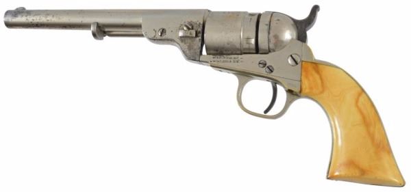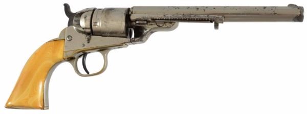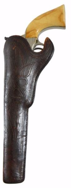 Serial no. 9642 .36 caliber cartridge conversion. with California pattern open top holster with carved floral design.