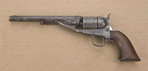 Colt Model 1861 Navy conversion revolver, .38 CF cal., 7-1/2” round barrel, blue and case hardened finish, wood grips, #3355. This gun is in overall very good + condition showing a dark brown patina with scattered pin prickpitting and some spots of erosion; all matching visible serial numbers except the wedge that is un-numbered; fine bore, crisp action and markings, iron trigger guard and brass backstrap with the majority of itssilver finish remaining; grips are very good with traces of original finish remaining, some wear and old mars from carry and storage; a very nice ’61 Navy conversion of which only approx. 2,200 were produced.Est.: $2,000-$4,000.