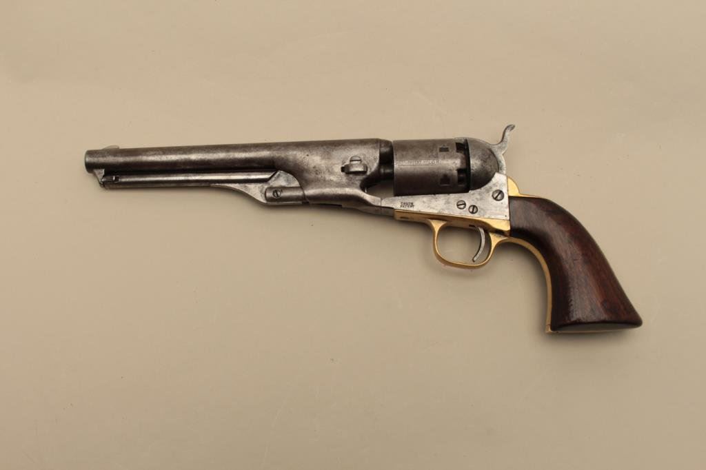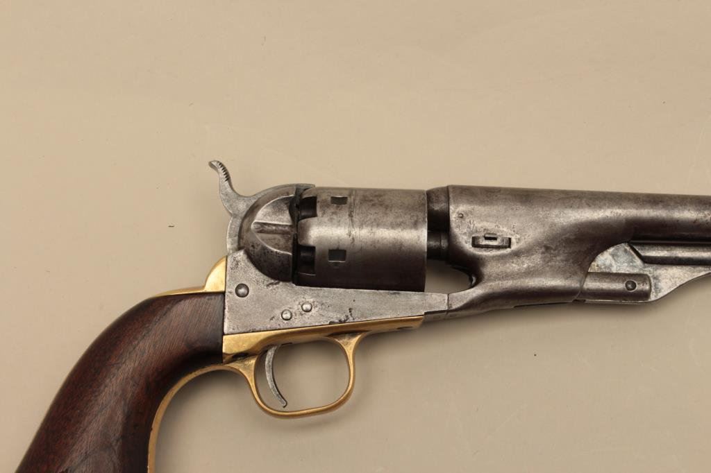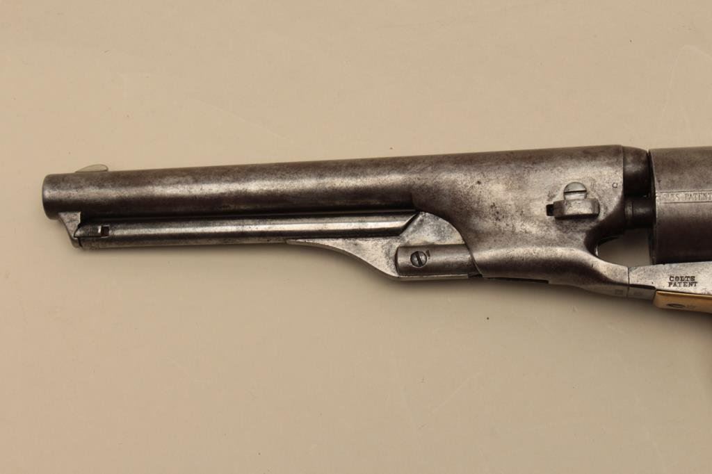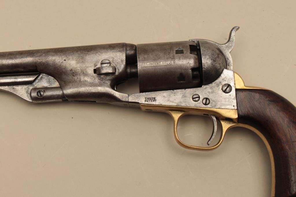 brass straps, grey patina, wood grips, S/N 6058 (all matching visible), in overall very good condition with a grey patina to metal surfaces, crisp action and very good grips. NOTE: This Navy is very scarce and desirable as it has martial inspections and a faint inspector’s cartouche on the left side of the grips; also a “L” at the top of the backstrap, “L” and “C” on the cylinder and “C” on both sides of the barrel assembly at the breech. (Antique). Est.: $2,000-$4,000.