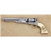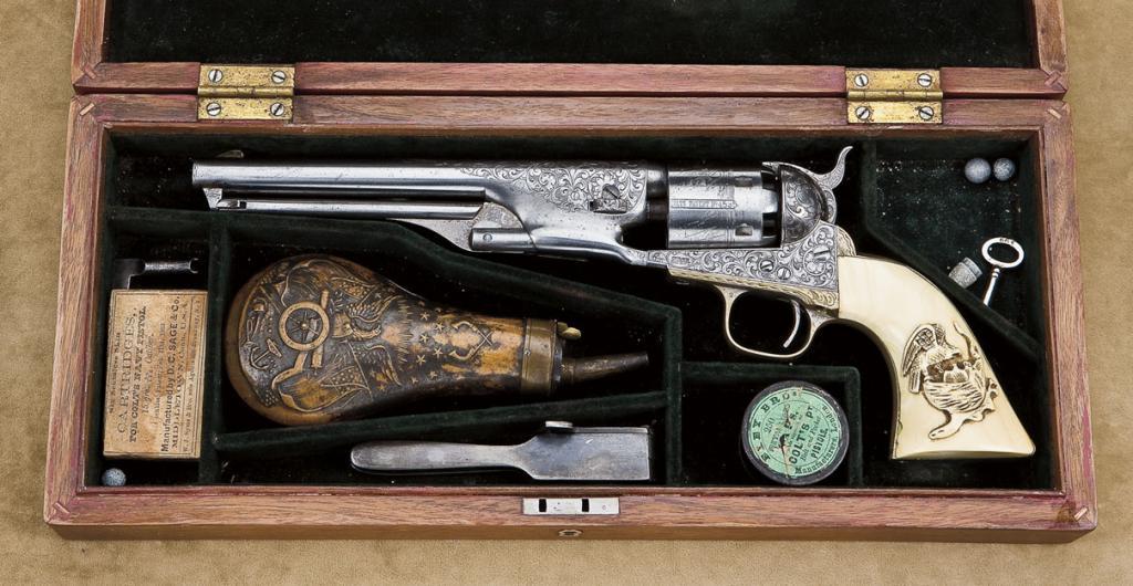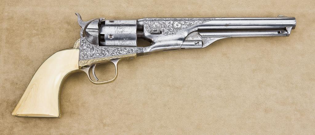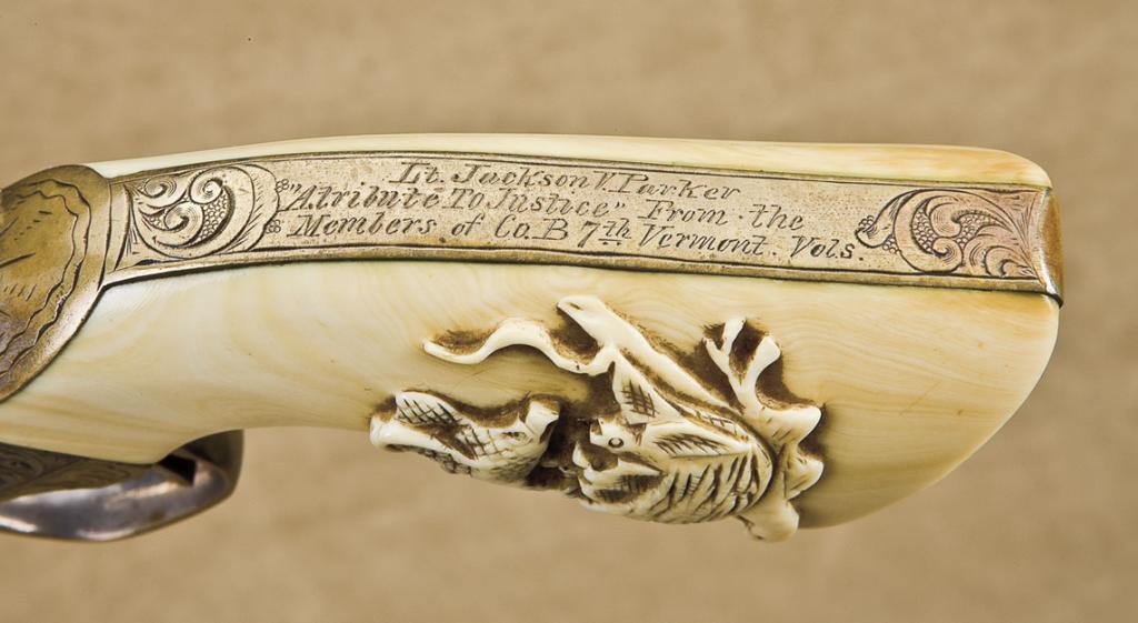 Colt Model 1861 Navy percussion revolver, factory engraved, raised carved ivory grips, .36 cal., 7-1/2” barrel, #14535 E, period inscribed on the backstrap: “Lt. Jackson V. Parker, ‘A Tribute to Justice’ from the members of Co. B, 7th Vermont Vols.” . This gun is in overall very good to excellent condition showing an old light cleaning to metal surfaces but still crisp action, engraving, majority of cylinder scene remaining, very good bore, nice patina on brass backstrap, outstanding ivory grips with rare raised spread eagle over nest of young; traces of case hardening still visible on engraved hammer. This gun was in the famous William Locke collection and is pictured on page 148 of the book on his collection by Schreiner and Berryman. Jackson V. Parker was born in Clarendon, Vermont on August 2, 1835. On February 4, 1862 he was commissioned as second lieutenant in Co. B, 7th Vermont Volunteer Regiment. He was promoted to Lieutenant on December 9, 1862 and to captain on October 22, 1863. He mustered out on March 14, 1866 and returned to Brandon, Vermont where he lived until his death on September 4, 1871. During the War, he fought at the siege of Vicksburg and the battles of Baton Rouge, Gonzales Station, Mobile and Spanish Fort. In addition to copies of his records from the National Archives and additional research materials, there are copies of a photograph of Captain Parker and an original copy of the hardback book, “7th Regiment Vermont Volunteers Veterans” by Holbrook, dated 1882. The gun is encased in a modern made presentation wood box with green velour lining, brass eagle and cannon slant tipped flask, Colt iron .36 caliber bullet mold, an Eley Bros. cap tin for Colt belt pistols, a combination nipple wrench and screwdriver and a cartridge skin pack by Sage for Colt Navy pistols. An important Civil War presentation engraved Colt Navy revolver formerly in the William Locke collection. Est.: $7,000-$14,000.