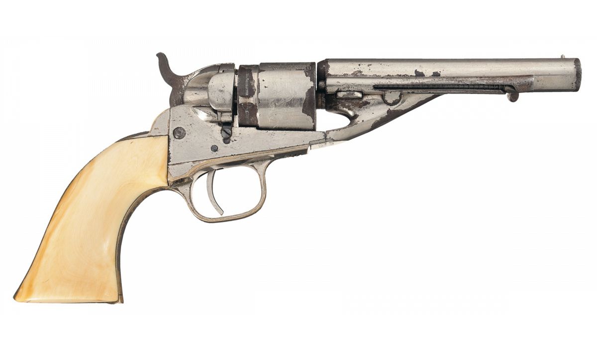 Manufactured in 1872 , this is one of approximately 24,000 Model 1862 Police and Pocket Navy revolvers that were converted to cartridge between 1873 and 1880. The frame is machined at the recoil shield and is fitted with a conversion plate that is notched for the rimfire firing pin. The rebated cylinder has been altered by cutting off the breech end but leaving the teeth. The loading lever has been removed and an ejector rod and housing mounted on the right side of the barrel. The top of the barrel is marked "ADDRESS COL SAML COLT NEW-YORK U.S. AMERICA". The cylinder is roll engraved with the stagecoach holdup scene and numbered "5185". The left side of the frame is marked with the two line patent dates and "36 CAL" is stamped on the left side of the trigger guard shoulder. The barrel is numbered "44798" and the frame, trigger guard and back strap are numbered "45185". Fitted with a smooth one-piece ivory grip.