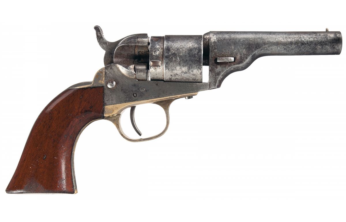 Condition: Very good. The revolver has a mottled gray patina with some minor pitting. Most of the cylinder scene remains. The grip straps retain 70% original silver plating. The grip is fine with a some minor handling marks and high edge wear with most of the varnish remaining. Mechanically fine.