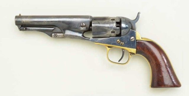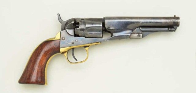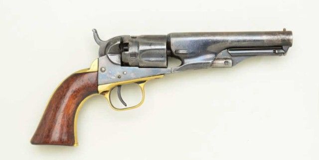 Colt Model 1862 Police 36 cal percussion, 4-1/2” barrel refinished and remarked number #2243. The Colt has been polished out and stamped with incorrect size modern type serial number stamps. The barrel address islight but visible. The grips have been refinished and are undersized. Action good, bore fair to good. From an old N.Y. collector’s estate. Est.;$300-$600.