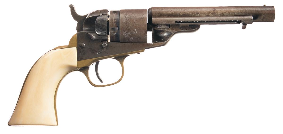 Condition: Very good. The barrel and cylinder retain traces of the blue finish, mainly in protected areas, with the balance having a smooth gray patina. The hammer sides and protected areas of the frame show strong original case colors, some minor oxidation on the right side of the frame and the balance a smooth mottled gray patina. There are strong traces of original dark silver in protected areas of the trigger guard with a dark, untouched aged patina on the balance. The slightly undersized later production replacement ivory grip is excellent with an attractive streaked caramel patina. The cylinder scene is fully visible, the markings remain clear and the action is excellent.