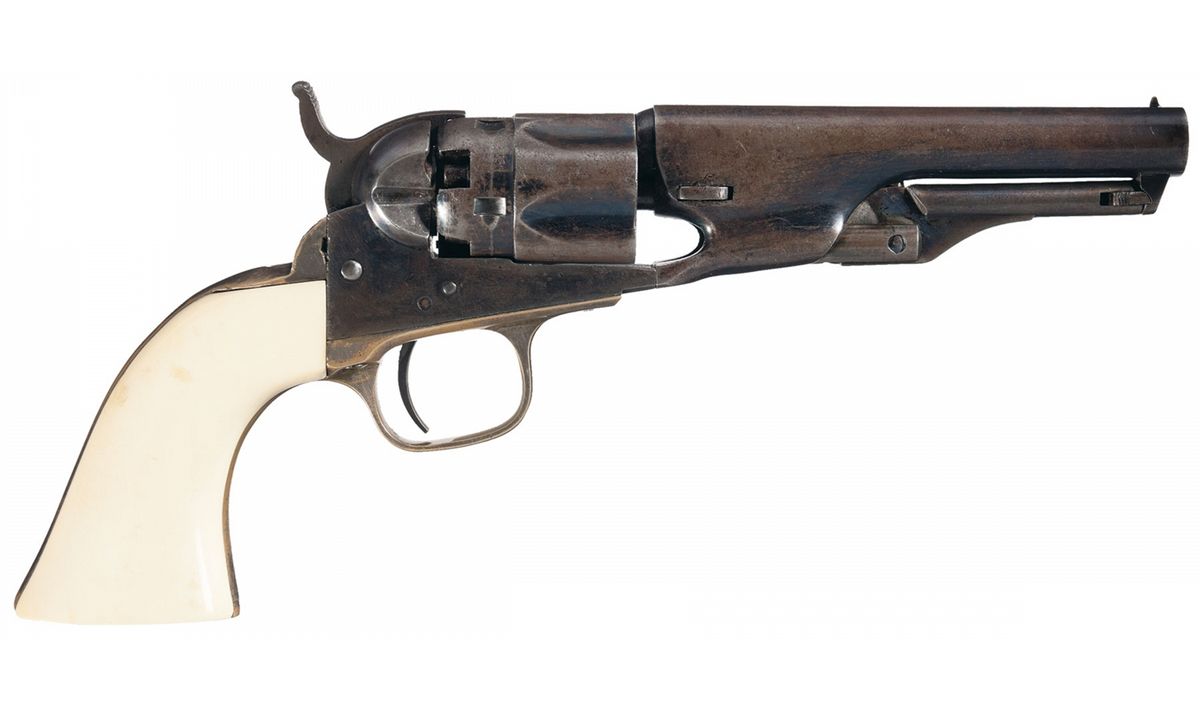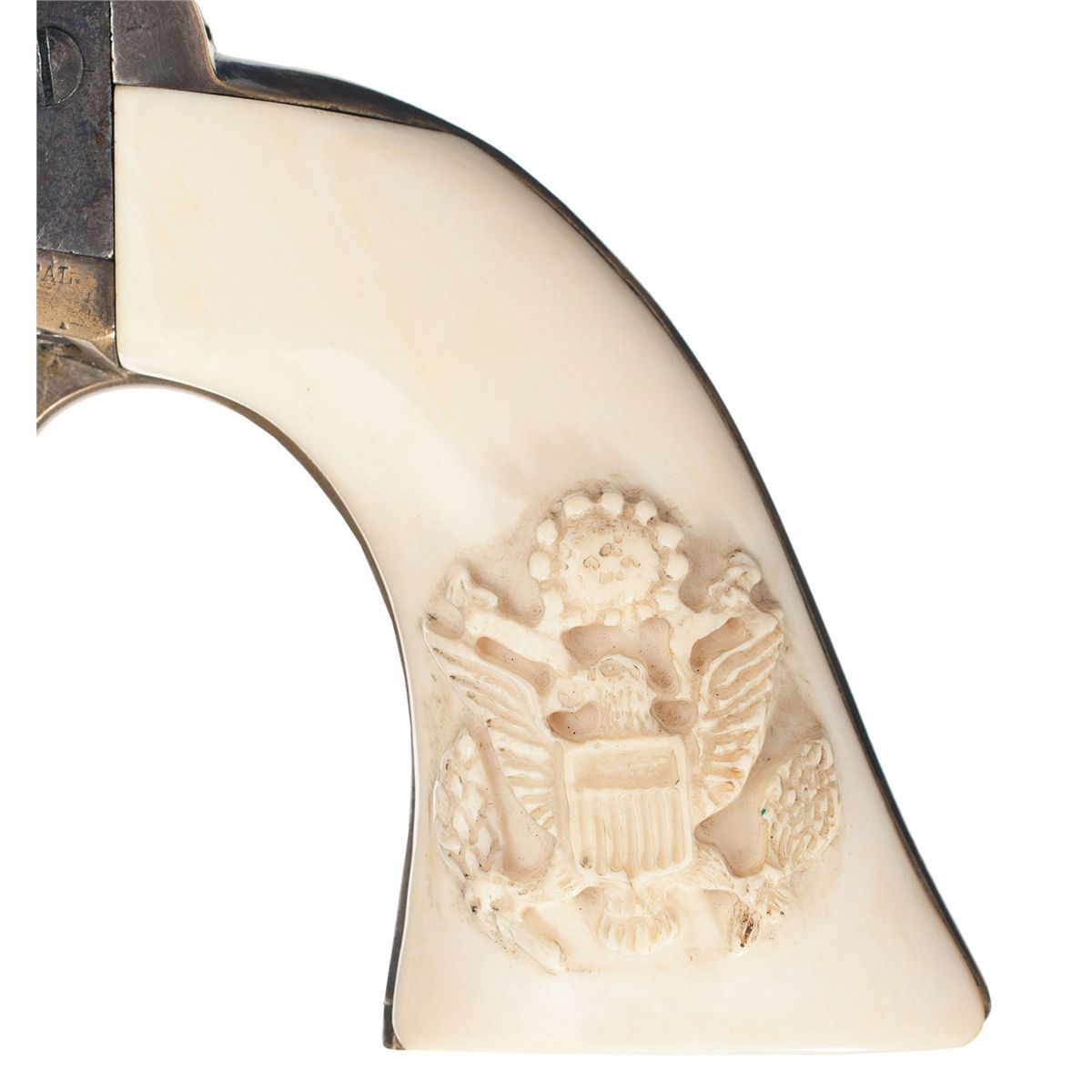 Manufactured during the Civil War in 1863. The top of the barrel is marked "ADDRESS COL SAML COLT NEW-YORK U.S.AMERICA", the left side of the frame is marked "COLTS/PATENT", and "36 CAL" is marked on the left trigger guard shoulder. One cylinder flute is marked with the 1850 patent date. The full matching serial number is stamped on the underside of the barrel lug, frame, trigger guard, backstrap and the wedge has been renumbered to match, "9232". Brass cone front and hammer notch rear sights, the barrel and cylinder are blue, the frame, loading lever, and hammer casehardened and the trigger guard and back strap silver plated brass. Fitted with an attractive modern replacement, one-piece ivory grip with an American eagle carved on the left side.