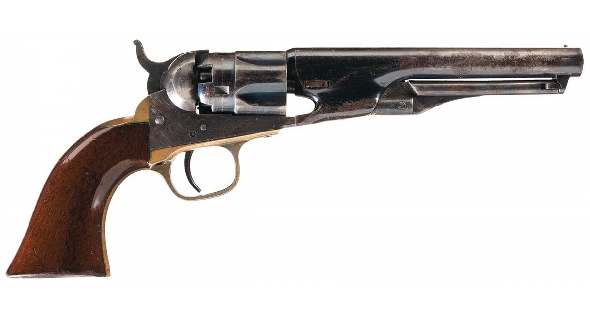 Very fine. The barrel and cylinder retain 70% original blue finish with a gray and brown patina on the balance. The right side of the barrel has some very fine pitting. The frame and loading lever retain 40% original dark case colors with a smooth bluish gray on the balance. The trigger guard and back strap show scattered original silver plating which has darkened with age. The brass has an untouched dark aged patina. The grips are also very fine retaining most of the original varnish showing some wear and minor chips on the lower edge, and overall some minor dents and dings. The markings are clear. The action is fine.
