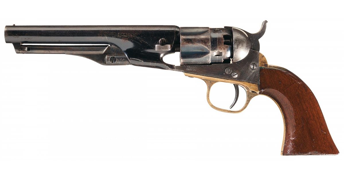 Manufactured in 1865. The top of the barrel is marked "ADDRESS COL SAML COLT NEW-YORK U.S.AMERICA", the left side of the frame is marked "COLTS/PATENT", and "36 CAL" is marked on the left trigger guard shoulder. Full matching serial number is stamped on the underside of the barrel lug, frame trigger guard and back strap and the partial number "9788" is stamped on the wedge, rear of the cylinder and on the cylinder pin. Blue finish, casehardened frame, hammer and loading lever with silver plated brass trigger guard and back strap. Fitted with a smooth one-piece varnished walnut grip.