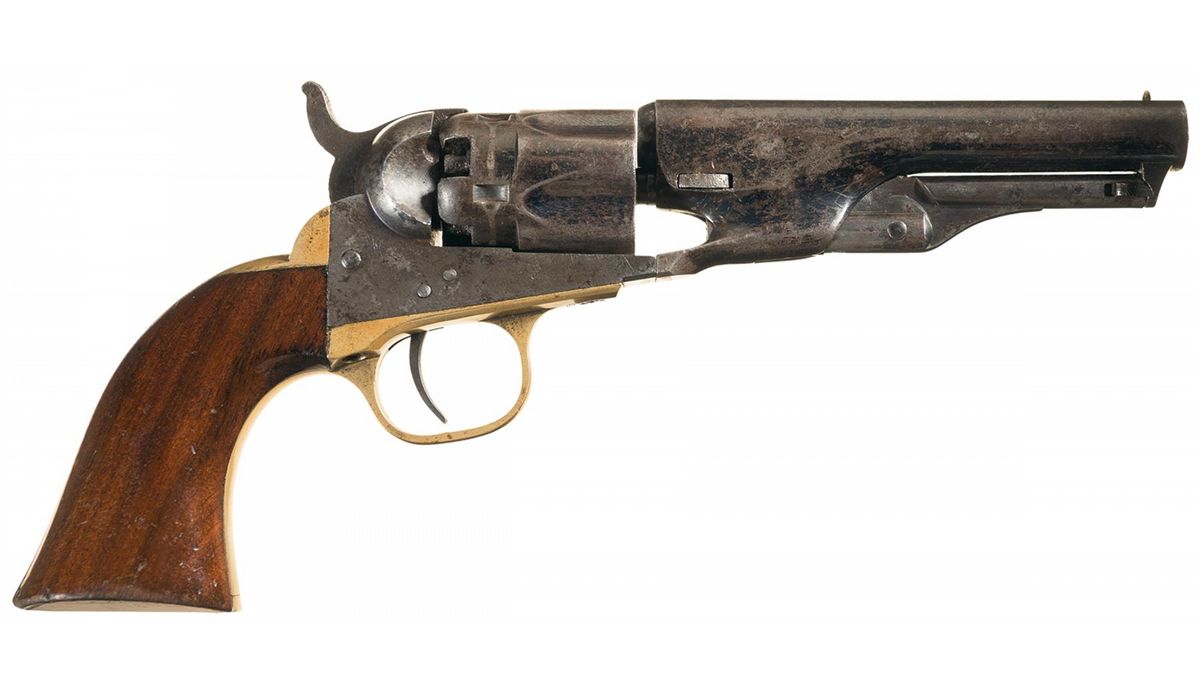 Fine. The barrel and cylinder retain 40% original bright blue finish with the balance a smooth gray patina. The frame and lever retain traces of original case colors. Some minor pitting is present. The grip straps have an attractive patina. The grip is very fine with some scattered minor handling marks and retaining most of the varnish. Mechanically fine.
