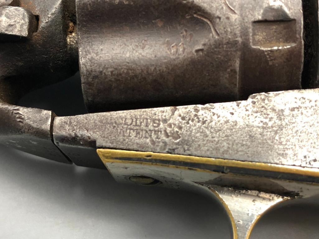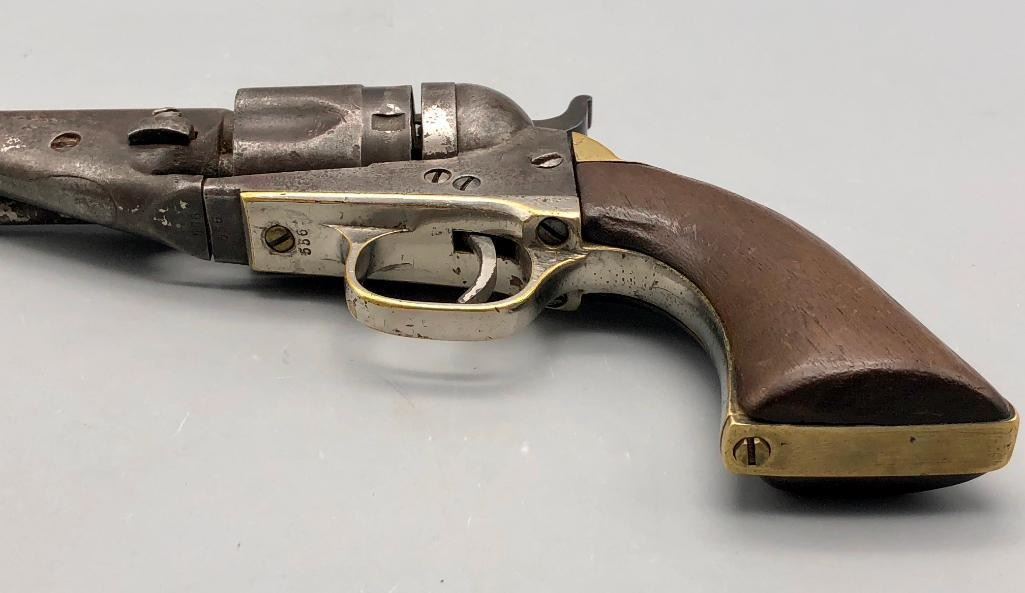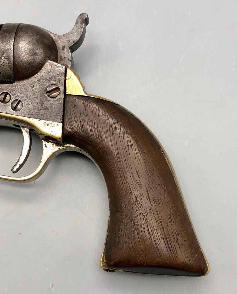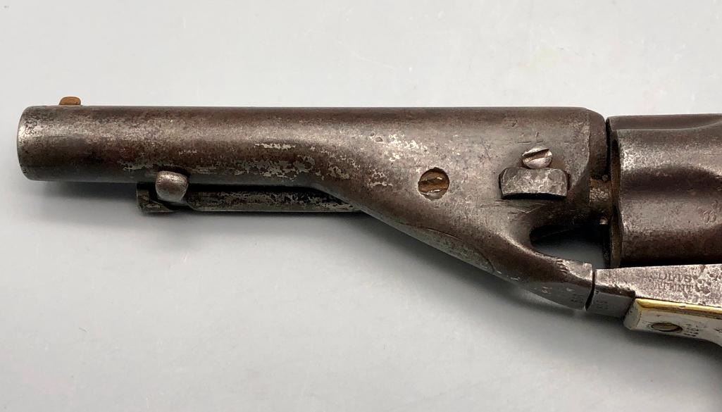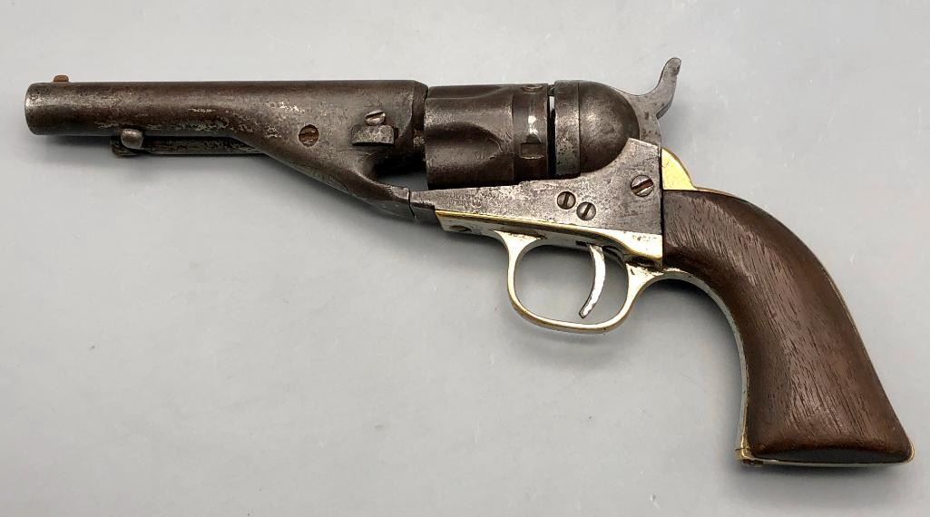 Presented for sale in this lot is a Colt Model 1862 Police Pocket Pistol. This revolver has a very low three digit serial number and is in decent condition for its age (showing signs of wear). The finish is nearly gone, there is some pitting and dings throughout. It has wood grips, which have some wear to the corners. It has a fluted cylinder and matching serial numbers on the barrel, frame and trigger guard (no serial number visible on the butt strap). It has the one line NY barrel address. This revolver cycles properly, however we have not fired it. Keep in mind this is an antique and not warranted safe to shoot and should not be attempted to without the aid of an expert. A nice addition to your antique gun collection! MAKER: Colt. Serial No.556. APPROX AGE: 1862. SIZE: Barrel is 4-1/2 inches long. CONDITION: Fair to poor for its age, normal wear expected. Please look closely at the pictures as they are an important part of our description and are hereby incorporated into the description, specifically with regards to condition. SHIPPING: There will be a $15 handling / packaging fee for shipping this lot. The actual cost of postage will be added on top of that. BUY IT NOW: If you would like to buy this item now, without waiting for the auction day to bid on it, we do offer this option (which is available up to 48 hours before the actual auction starts). The “Buy it Now” price is the high estimate of this lot (plus applicable fees and the Buyer's premium is discounted to 10% when using the Buy it Now option). If you would like to exercise this option, you must contact us by email (or phone as long as you talk to someone live). Reference this lot number and your intention to "Buy it Now." *****ANTIQUE - This firearm DOES NOT REQUIRE an FFL Transfer*****