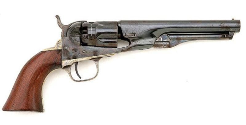 serial #21980 all matching including wedge, .36 caliber, 5 1/2" round barrel with a bright excellent bore. This is a very fine Colt Police. The barrel and cylinder retain about 80% bright original blue finish overall with flaked areas bearing a pleasing smooth brown patina. The frame retains 90% plus bright original color case-hardened finish with a couple areas on right side which have turned to a smooth brown but are surrounded by bright color. The loading lever shows fiery original color case-hardening. The brass gripstraps retain about 50% original silver plated finish with most loss being on backstrap. The one piece walnut grip rates excellent with lots of original finish remaining and with some very light crazing to the finish. A crisp little Police suitable for casing.
