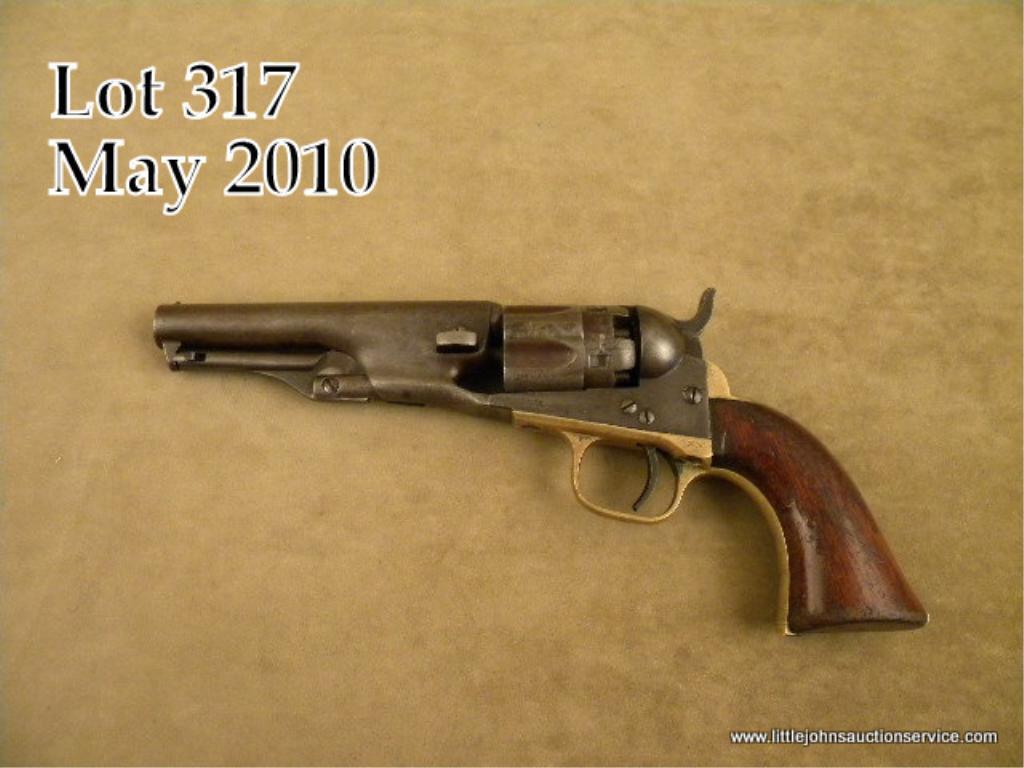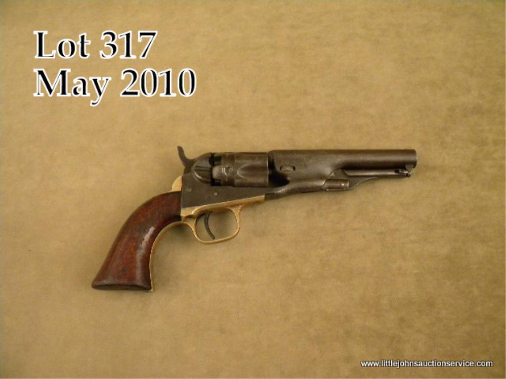 Colt Model 1862 Police percussion revolver, .36 cal., 4-1/2” round barrel, blue and case hardened finish, wood grips, #16528. This gun is in overall good condition showing an even brown patina on metal surfaces with some slight hints of casecolor on the frame and loading lever; all matching visible serial numbers except the wedge which is unmarked. The action is good, the bore fair and the grip and back straps show an uncleaned taffy colored patina; the markings are good and thegrips are overall good with scattered nicks and mars from carry and storage but still show approx. 60% original finish. Est.: $800-$1,600.