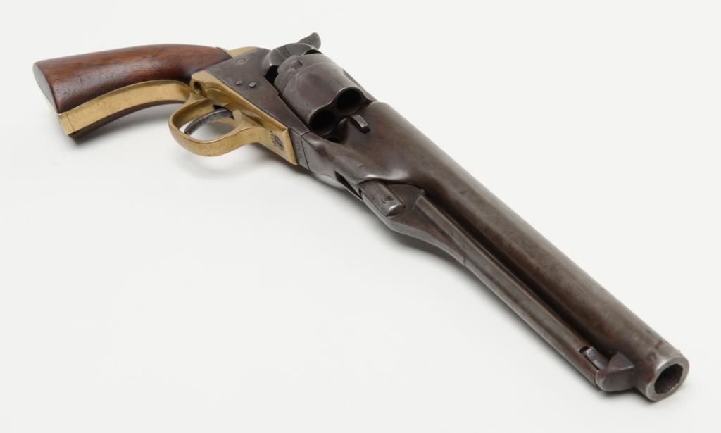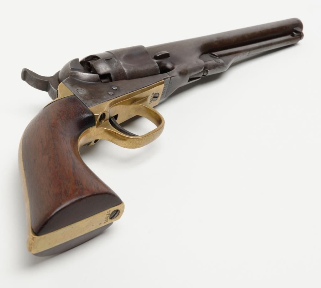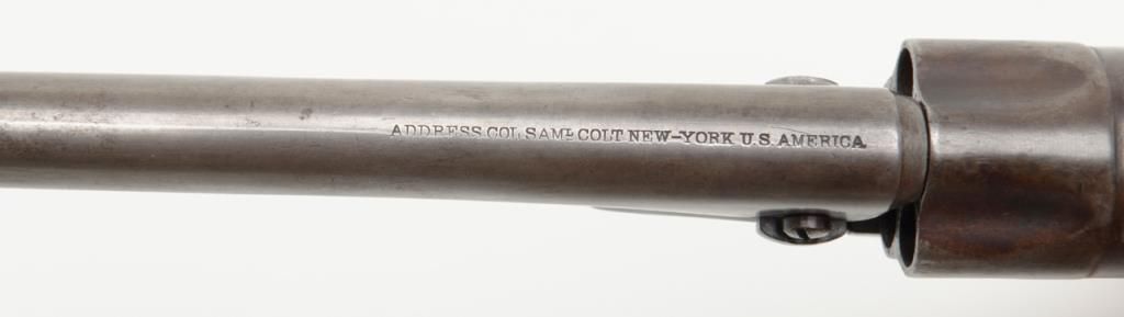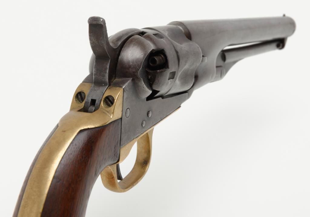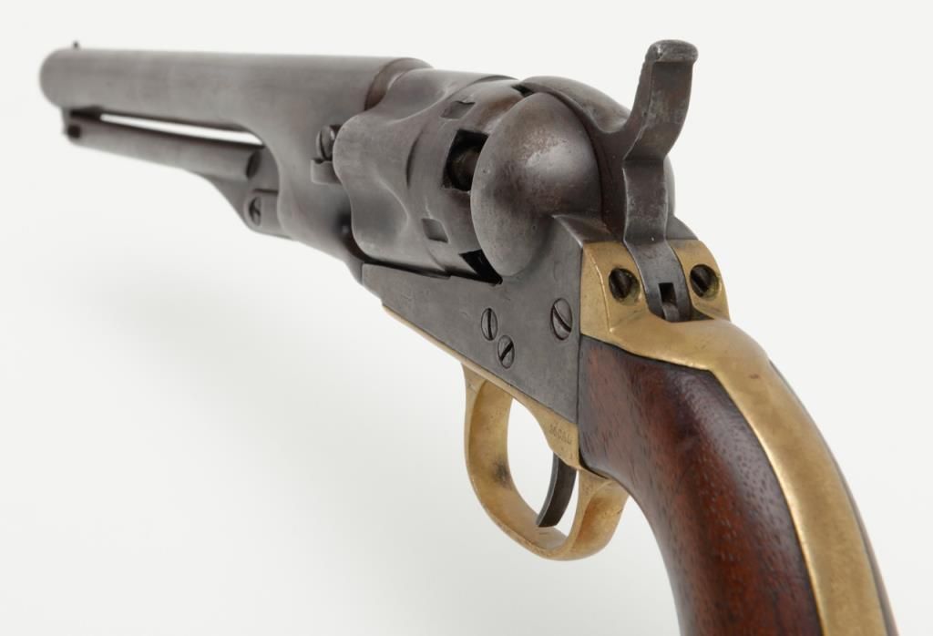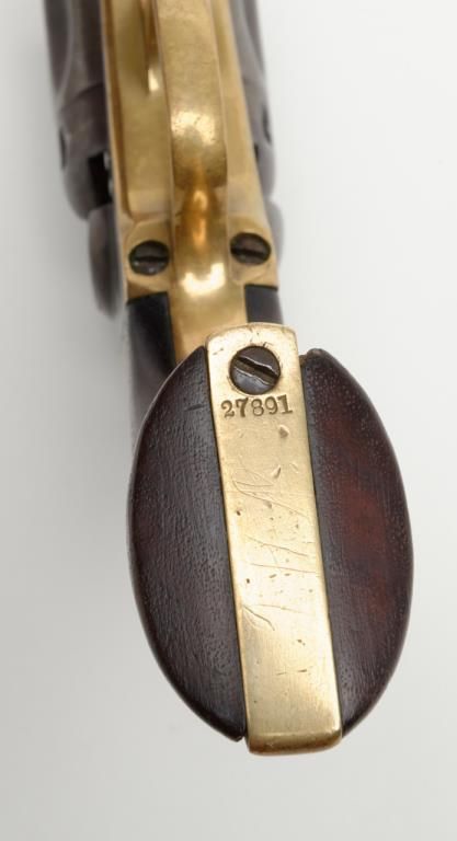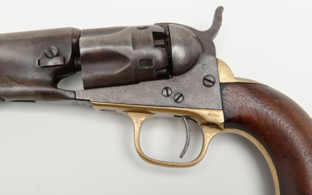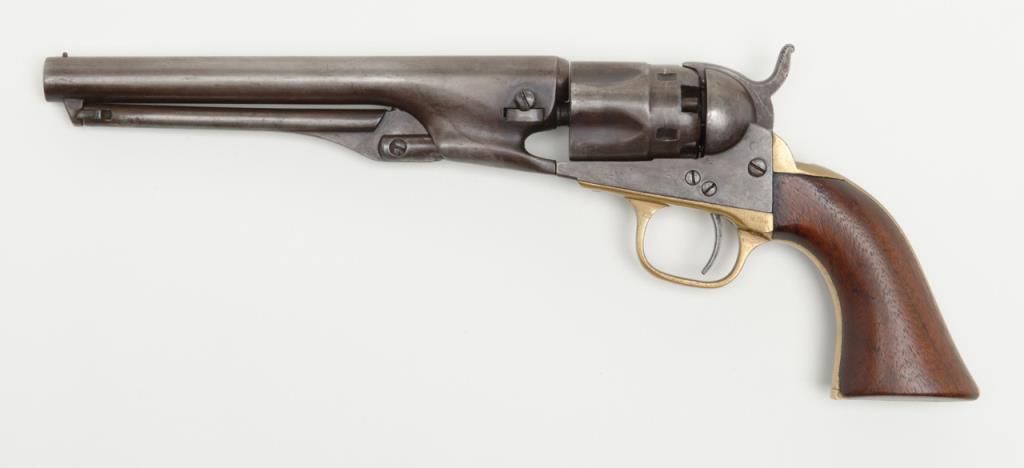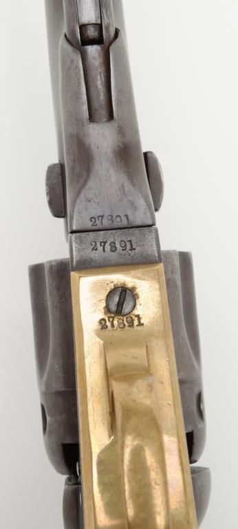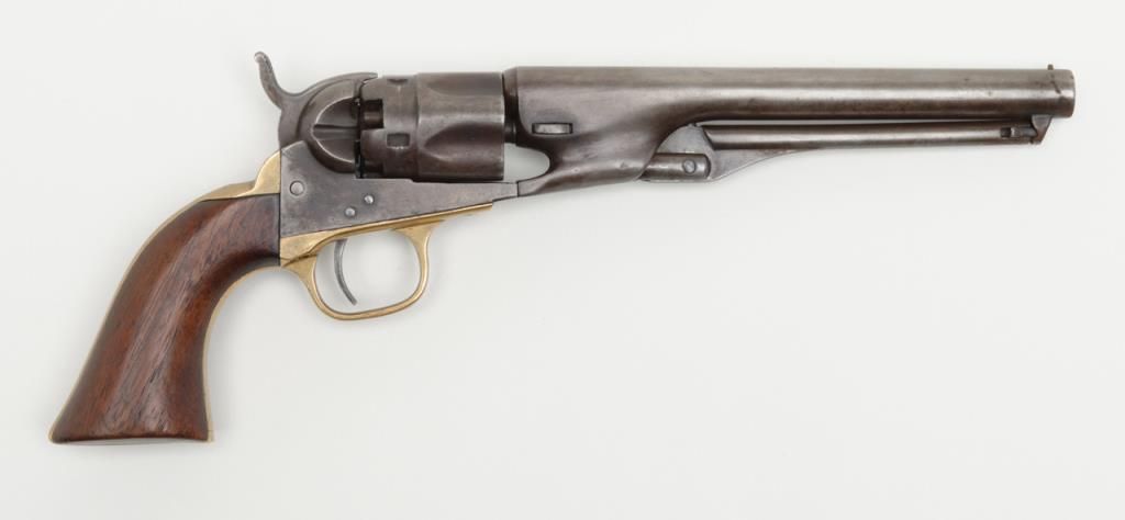 Colt Model 1862 Police percussion revolver, .36 cal., desirable 6-1/2” barrel, wood grips, #27891 in overall very good condition showing a grey/brown patina to metal surfaces, all matching numbers except the wedge which is #58857, crispaction, sharp markings, bore should clean to good +, very good grips with a slight old loss to the front left toe; made circa 1866. (Antique). Est.: $800-$1,600.