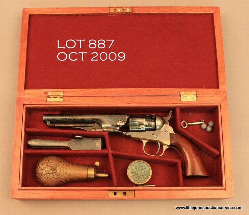 Colt Model 1862 Police percussion revolver in modern-made wood case with accessories, .36 cal., 5-1/2” barrel, blue and case hardened finish, wood grips, #7264. This gun is in overall very good to excellent condition showing approx. 50% originalblue on barrel assembly, case color on frame has gone to silver, approx. 40% original silver remains on trigger guard and back strap. The bore is good, the action crisp and the grips are very good. The modern made case is very good withmaroon lining and good condition Colt flask and Colt bullet mold. Also included is a cap tine and key to the case. Est.: $800-$1,600.