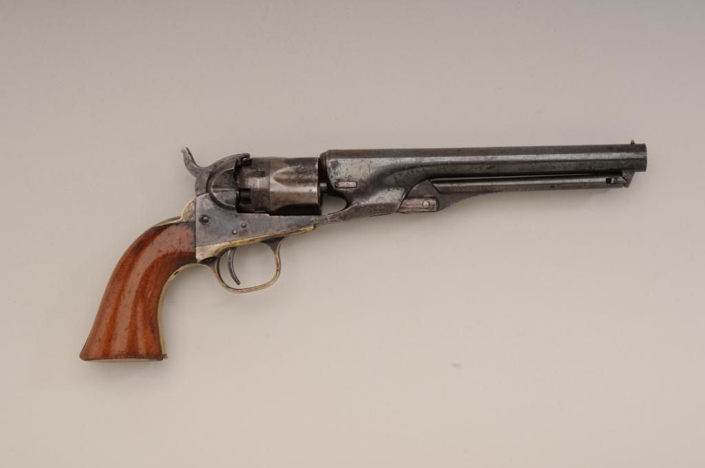 Colt Model 1862 percussion revolver, .36 cal., 6-1/2” barrel blue and case hardened finish, wood grips, #23950. This gun is in overall very good + uncleaned condition showing approx. 40% original blue on thebarrel assembly/cylinder and approx. 60% original case colors on the frame with scattered areas of surface rust, erosion and pitting from poor storage; the bore is near fine, the action and markings crisp and allmatching visible serial numbers including the wedge and cylinder arbor; traces of original silver remain on the brass straps; one lower frame pin is absent but the barrel assembly still is tightly linked to the frame. Thegrips are good with some scattered old mars and scratches and considerable remaining finish. Est.: $2,400-$2,800.