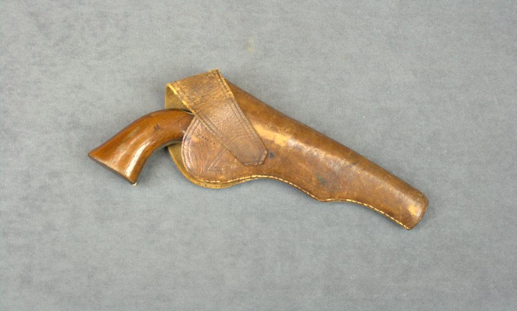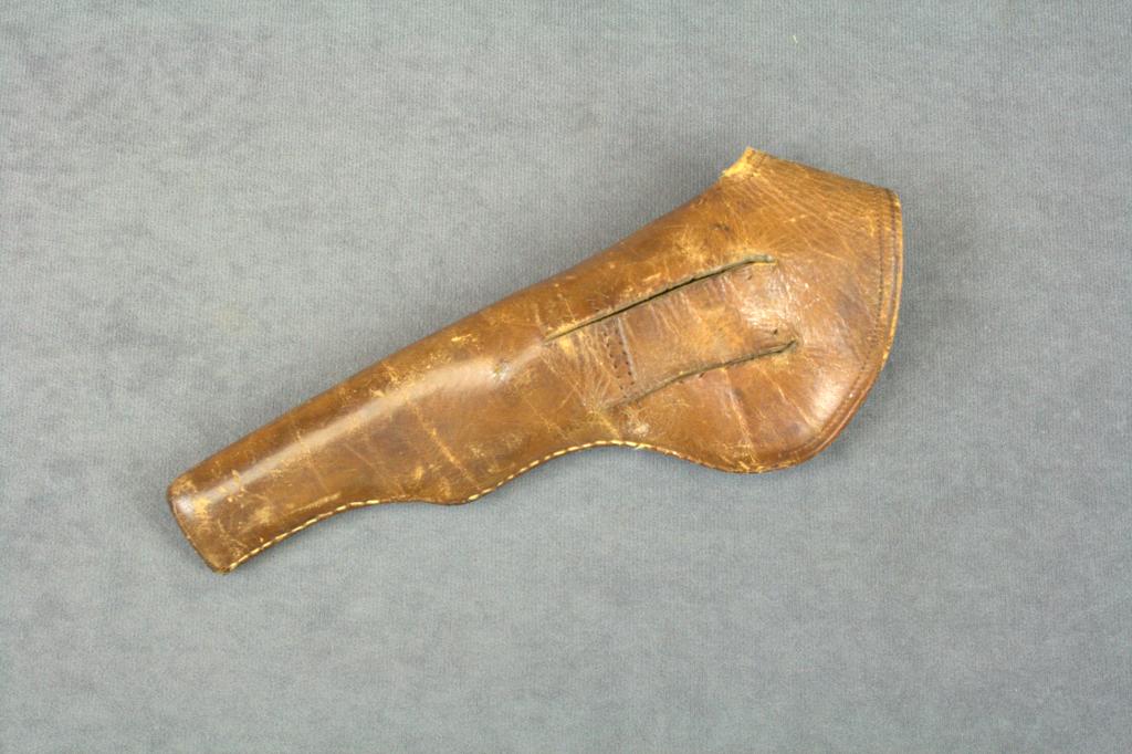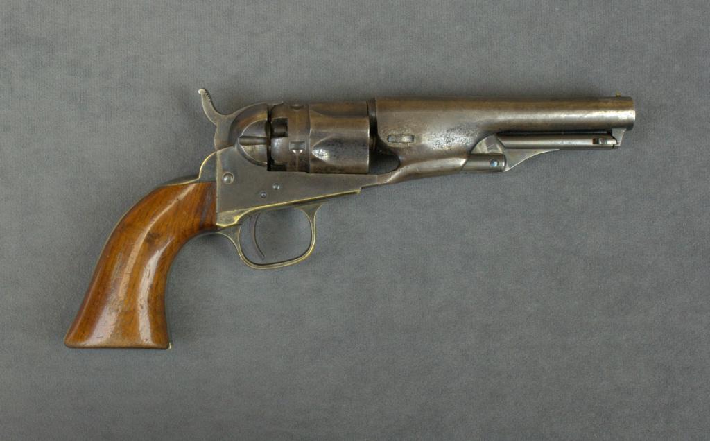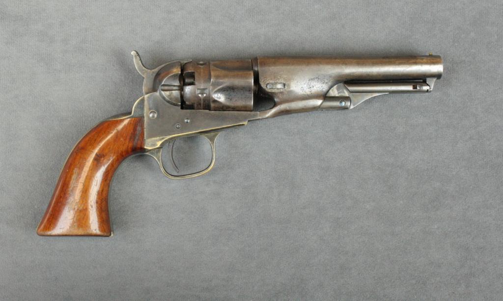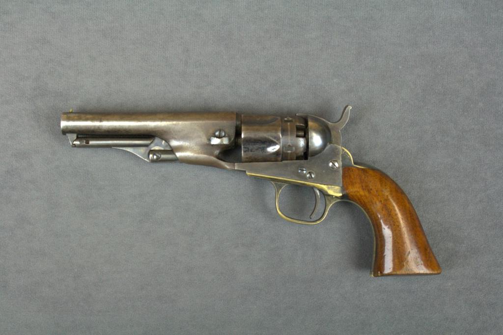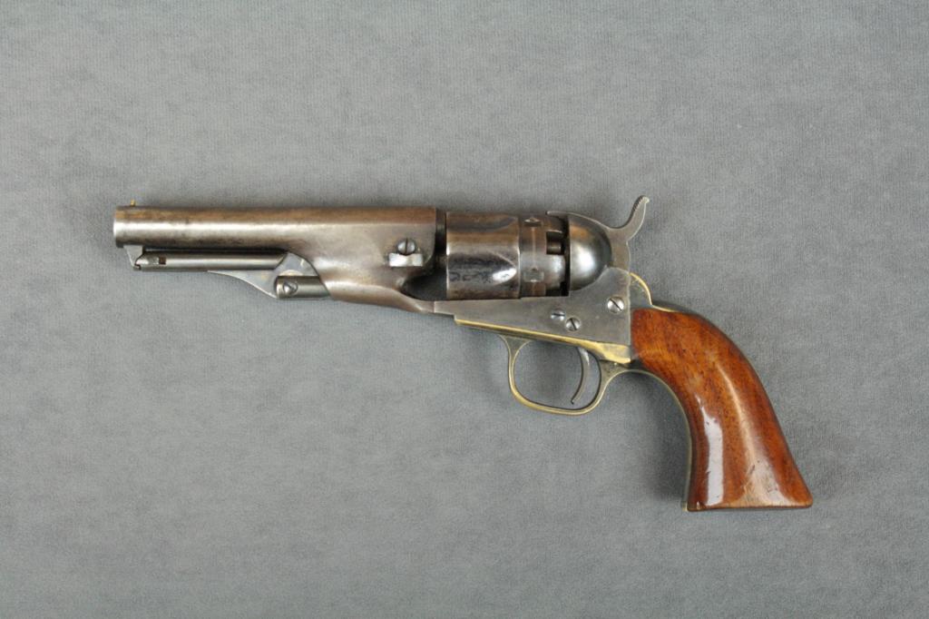 Colt Model 1862 percussion revolver, .36  cal., fluted cylinder, blue and case hardened  finish, wood grips, #4741. This gun is in  overall very good to fine condition showing  approx. 30% original blue in protected areasand approx. 80% original case colors on  frame, hammer and rammer; very good bore,  action is not revolving cylinder, very good  markings, all matching visible serial  numbers, very good grips; accompanied by aperiod leather flap holster in overall good  condition showing some scuffing and  separation of old stitching.  Est.:   $1,000-$2,000.