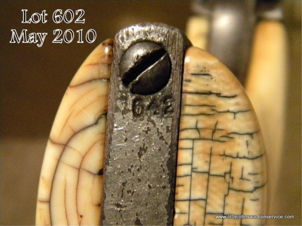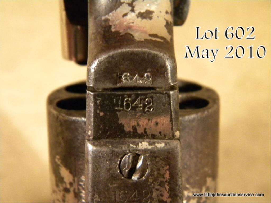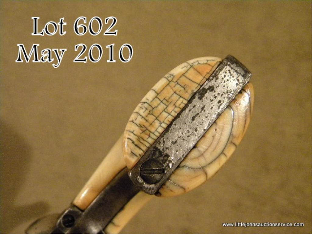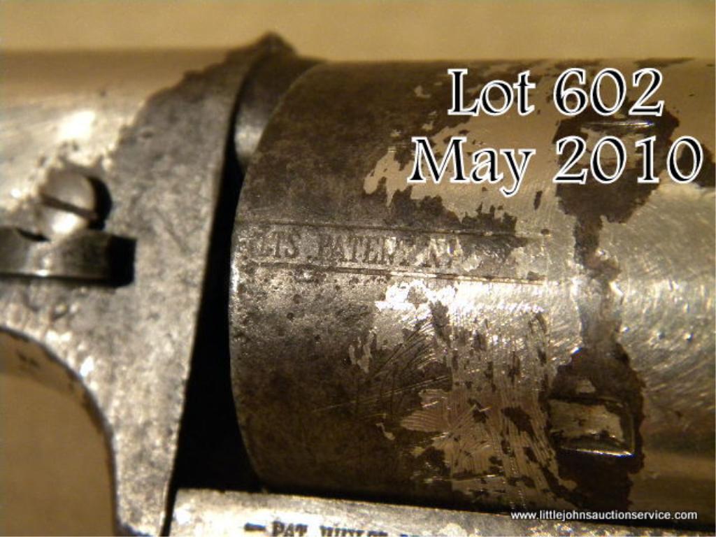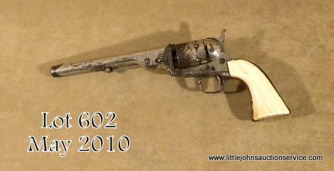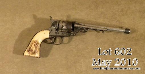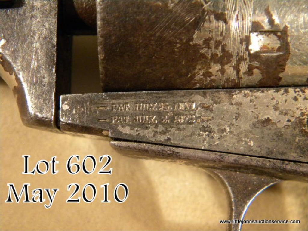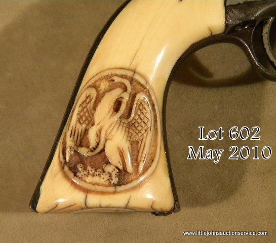 Colt Model 1871-72 Open Top cartridge revolver, .44RF cal., 7-1/2” barrel, nickel finish, raised carved ivory snake and eagle grips, #1642. Factory letter accompanies this gun and verifies caliber, barrel length and finish, stocks not listed,shipped to Schuyler, Hartley & Graham, New York, NY on September 6, 1873 in a shipment of 31 guns. This gun shows approx. 65% nickel finish with balance gone to a dark grey patina, matching visible serial numbers except cylinder which isun-numbered but retaining approx. 95% cylinder scene; bore may clean to good, crisp action, good markings, lovely old ivory raised carved snake and eagle grips that are in overall good condition showing honest wear, beautiful color with someslight old edge losses and somewhat undersized for this gun but definitely period. An untouched desirable Open Top with factory letter. Only approx. 7,000 were produced between 1872 and 1873. Est.: $6,000-$7,000.
