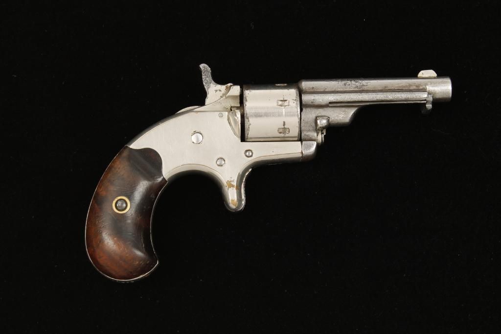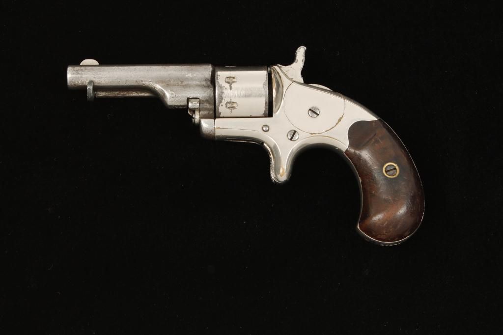 Colt Model 1872 .22 caliber, 7 shot open top revolver in early production series with integral ejector rod housing serial number 2624P. This open top shows a 2 9/16” barrel and original nickel plated finish for whichthe P follows the serial number.. The pistol retains 75% to 85% original nickel on cylinder and frame with about 10% nickel on the barrel. The barrel shows some moderate pitting and light cleaning long ago. Thebarrel shows a good two line address. An oversized ejector rod head has been added long ago and the ejector rod spring is missing. The grips show traces of varnish with some dings and mars and at least good.There is some pitting on the front of the cylinder and the top of the hammer that is minor. The action is working and the front sight blade has been reshaped. A late serial number transition of model 1872 with ejectorrod housing and short barrel. Est.: $600-$1200