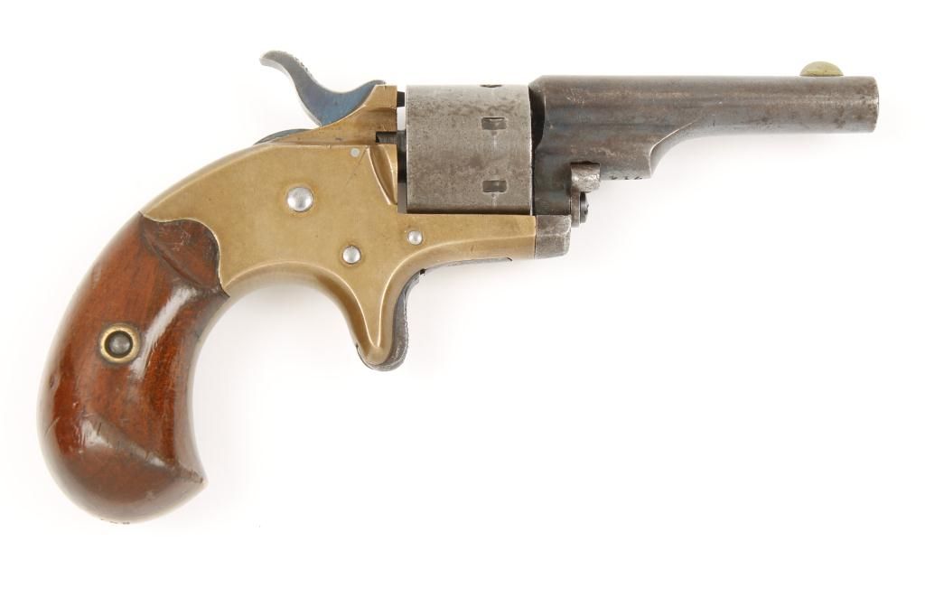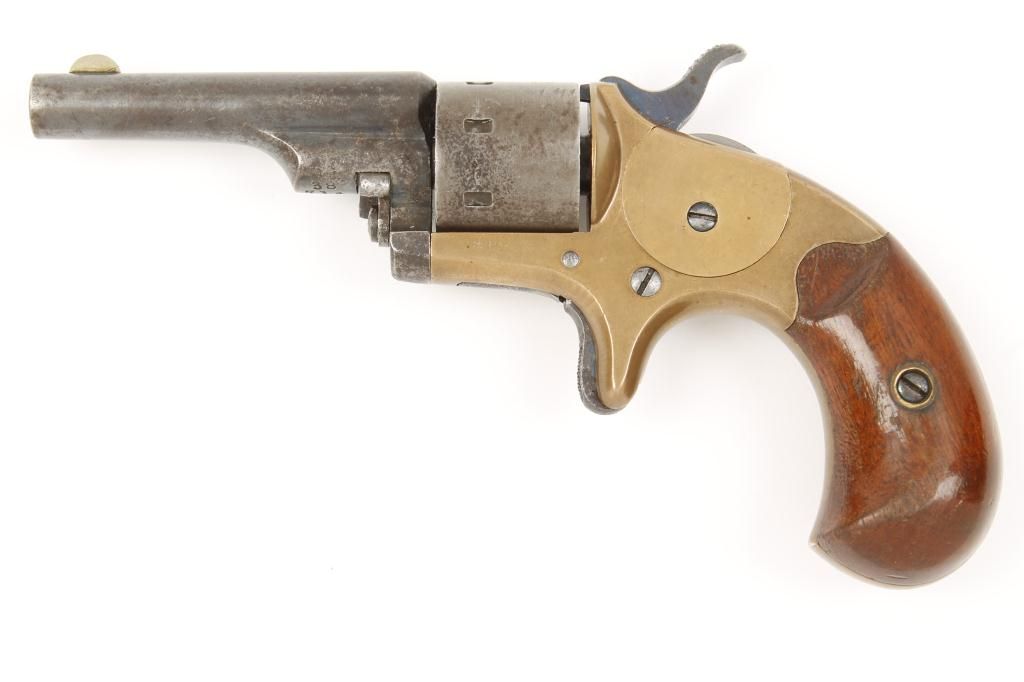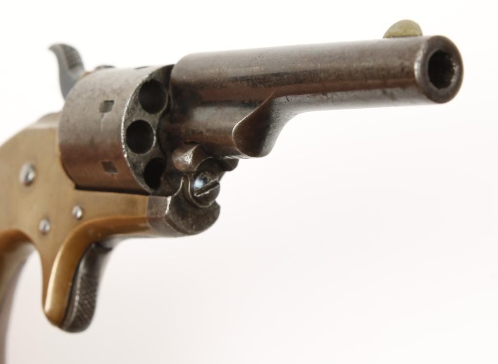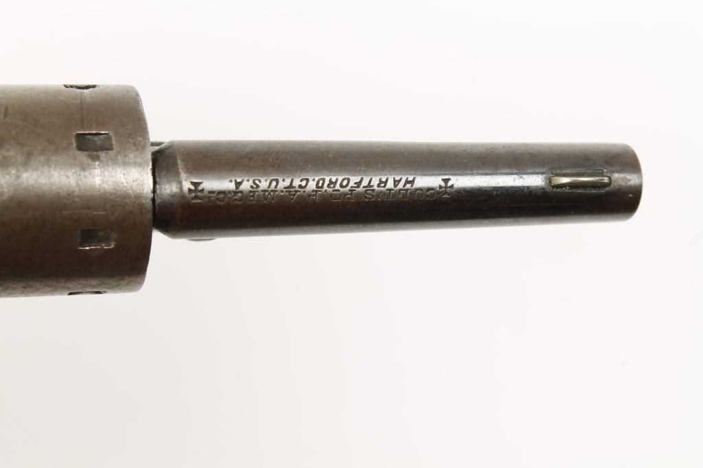 Colt Model 1872 .22 caliber, 7 shot open top-revolver in very good original condition, serial number 38714. The barrel shows 50% to 70% original blue that is evenly drifting and toning with some minor scattered lighterosion and normal aging just starting. The cylinder has drifted to gray with some slight erosion. The frame is a nice dark honey color and un-cleaned. The grips are very good plus with some edge wear and 75% to 85%original varnish. The action is working well and the barrel address is sharp. The hammer and trigger show considerable bright fire blue finish. Matching serial numbers. Est.: $350-$700