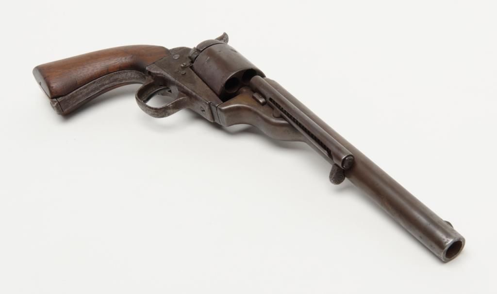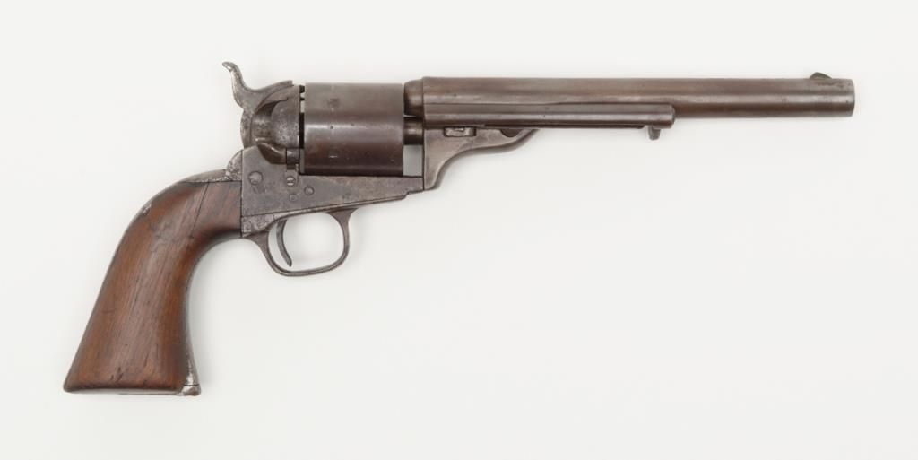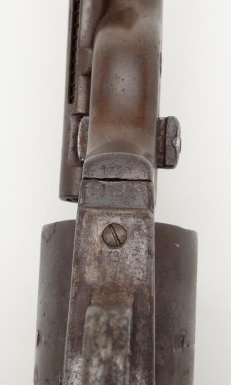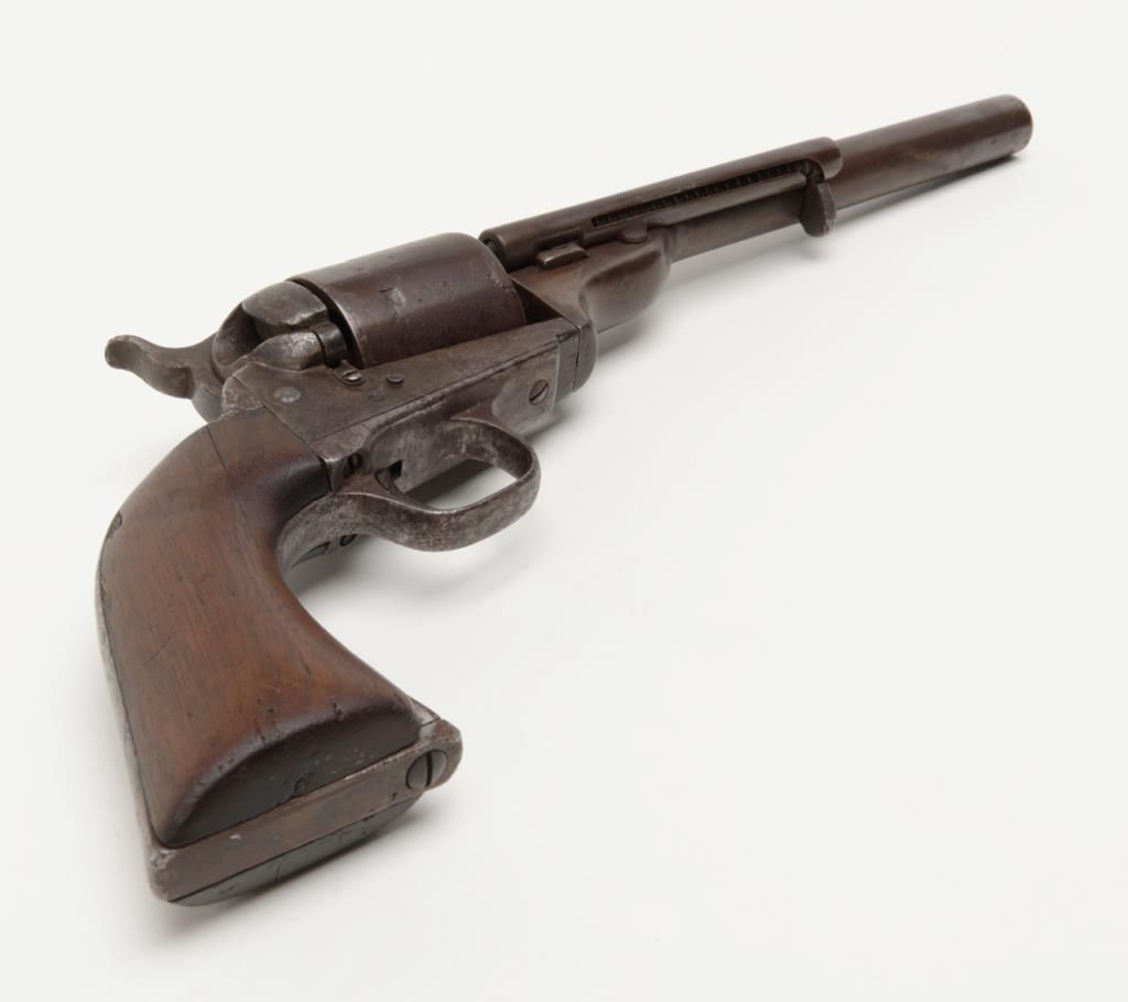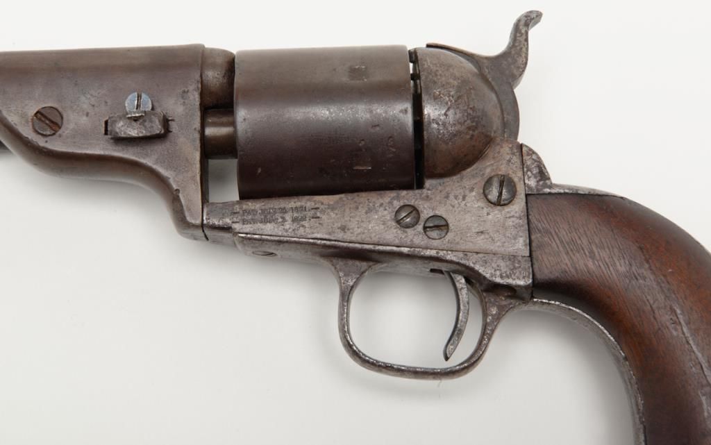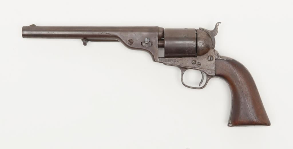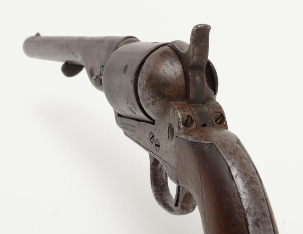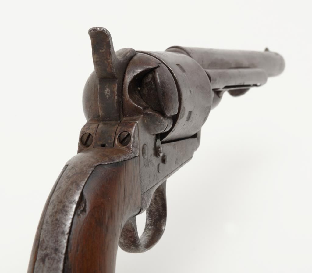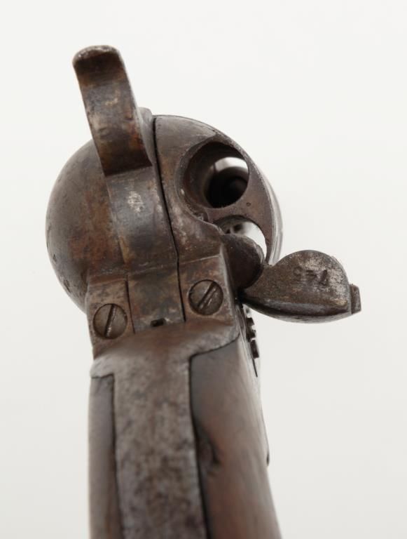 Colt Model 1872 Open top cartridge revolver, .44RF cal., 7-1/2” barrel, wood grips, #1730, in overall fair to good condition showing scattered areas of pitting, brown finish, dark bore, good action, visible two-line patent address on leftside of frame, working loading gate, wood grips are worn but good overall with an old repaired crack to the left grip. A desirable and hard-to-find specimen in the Colt revolver series as only 7,000 of the Model 1872’s weremanufactured and for some reason, many seem to have found their way south of the border where they received heavy use and were often extensively modified. Est.: $2,500-$5,000.