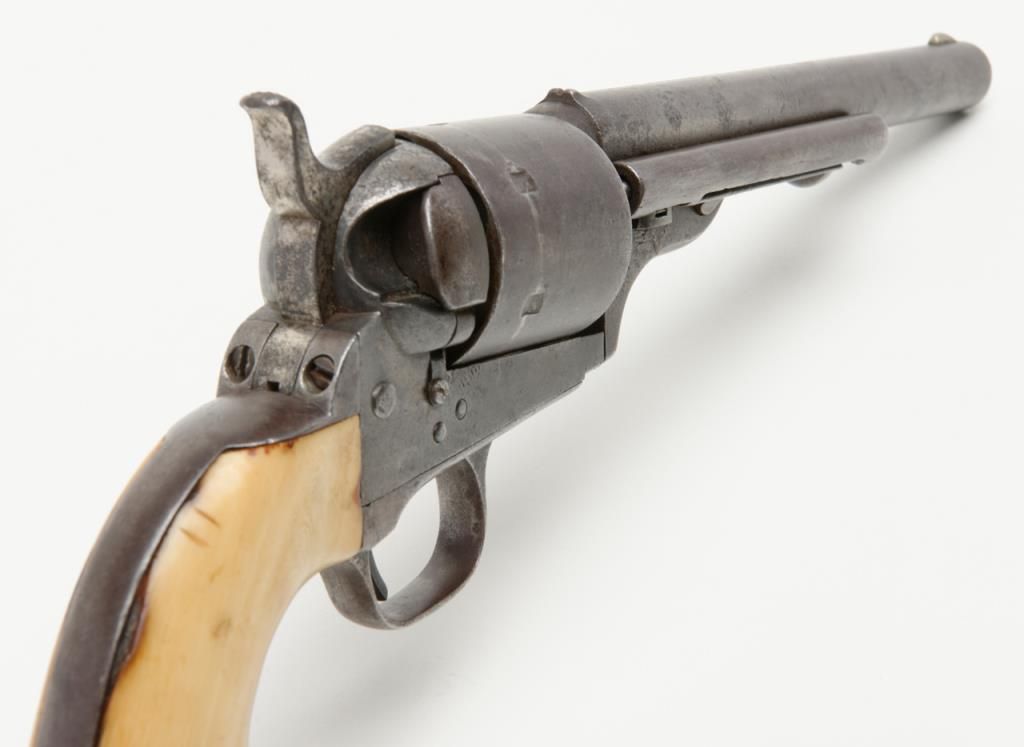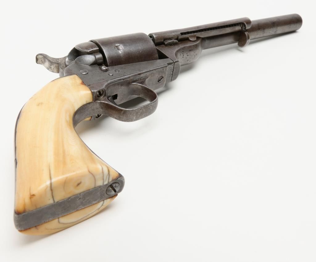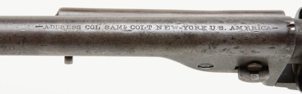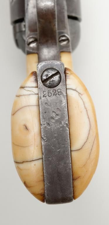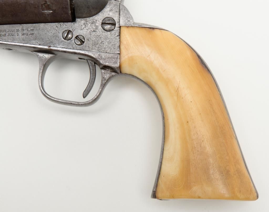 Colt Model 1872 open top .44 rim fire caliber revolver with factory 7 ½” barrel, iron back strap and trigger guard of Army size with genuine to the period ivory grips, serial number 2528. Factory letter states “Shipped to Spies Kissam &Company, New York, New York, August 12, 1873, 25 guns in shipment” with blue finish, barrel length and caliber confirmed but the grips not listed. The metal surfaces remain in good original condition with even patina and some scatteredlight to moderate erosion and pinprick pitting. There are some dings, mars and scratches but generally good to very good overall. The barrel address and patent marks are good and clear. There is traces of cylinder scene but very faint. Theivory grips fit impeccably and shows some small losses and scorching from lifting wire handled pots out of the camp fire. The firing pin on the hammer shows an old replacement or repair and the ejector rod head also an old repair orreplacement. The action is tight and the bore is slightly rough but the barrel has never been stretched. A very acceptable early frontier era Colt open top that appears to have went West. Est.: $4000-$8000