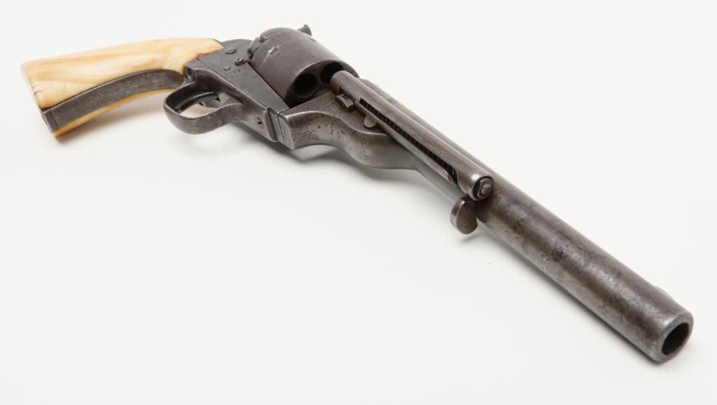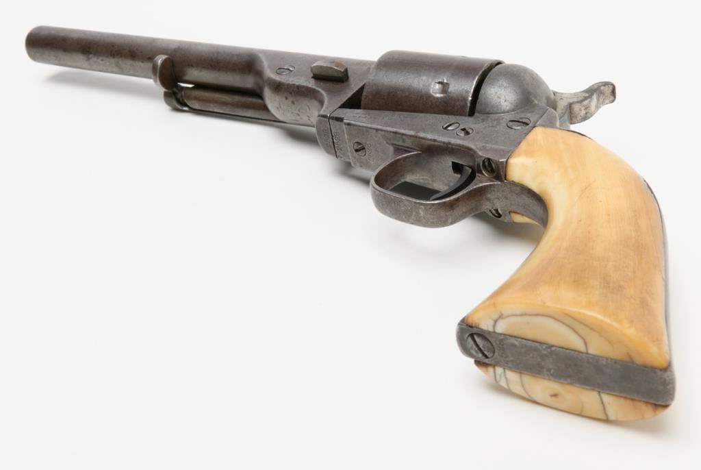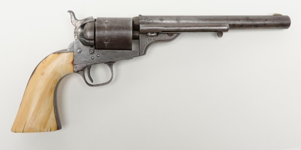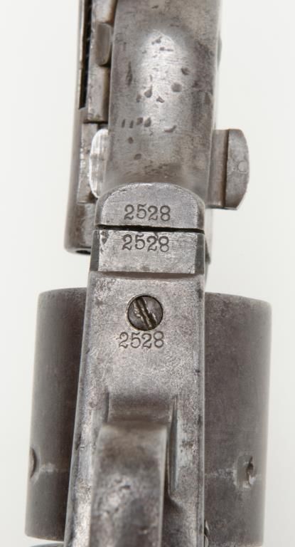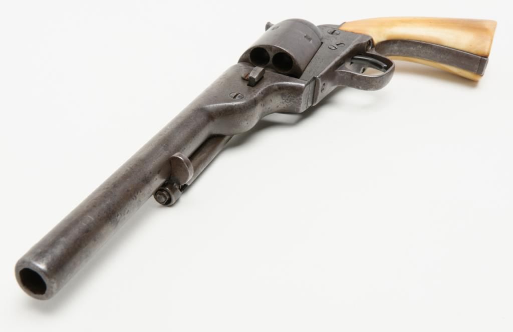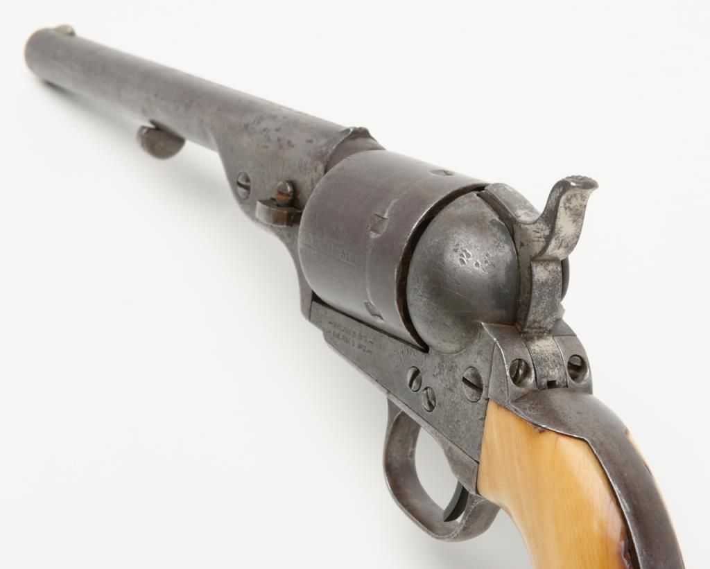 Colt Model 1872 open top .44 rim fire caliber revolver with factory 7 ½” barrel, iron back strap and trigger guard of Army size with genuine to the period ivory grips, serial number 2528. Factory letter states “Shipped to Spies Kissam &Company, New York, New York, August 12, 1873, 25 guns in shipment” with blue finish, barrel length and caliber confirmed but the grips not listed. The metal surfaces remain in good original condition with even patina and some scatteredlight to moderate erosion and pinprick pitting. There are some dings, mars and scratches but generally good to very good overall. The barrel address and patent marks are good and clear. There is traces of cylinder scene but very faint. Theivory grips fit impeccably and shows some small losses and scorching from lifting wire handled pots out of the camp fire. The firing pin on the hammer shows an old replacement or repair and the ejector rod head also an old repair orreplacement. The action is tight and the bore is slightly rough but the barrel has never been stretched. A very acceptable early frontier era Colt open top that appears to have went West. Est.: $4000-$8000