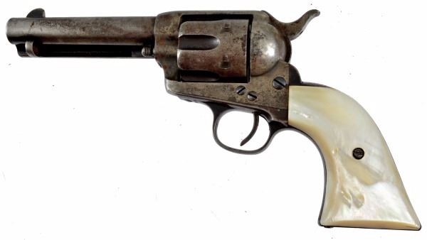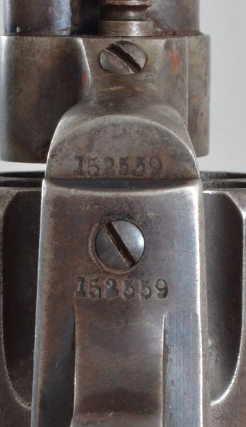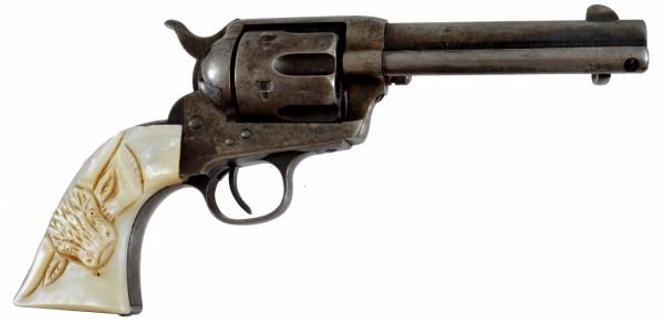 Serial no. 152559 .41 4 3/4" barrel in good working condition. tight action. grey brown patina with traces of finish in protected areas. carved steer head grips.
