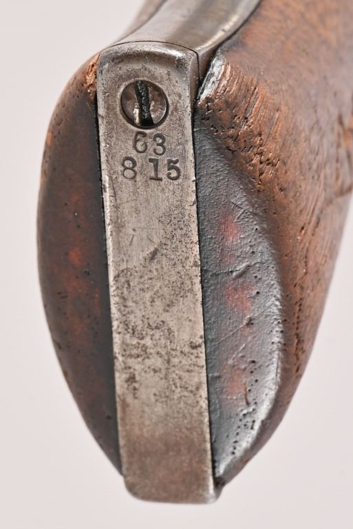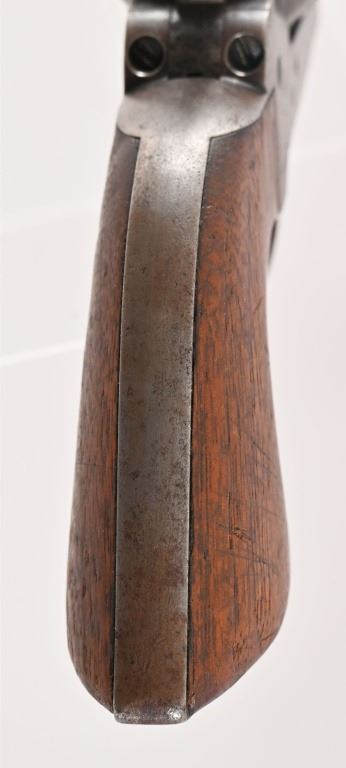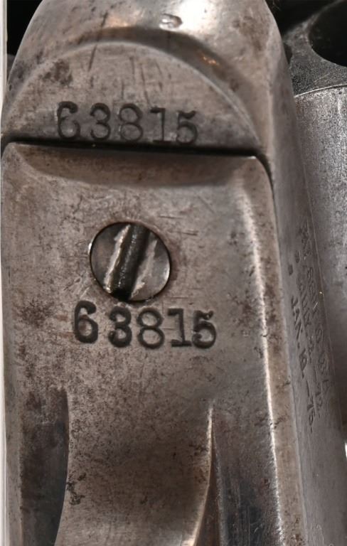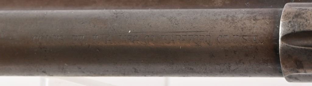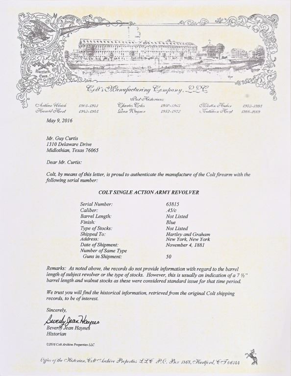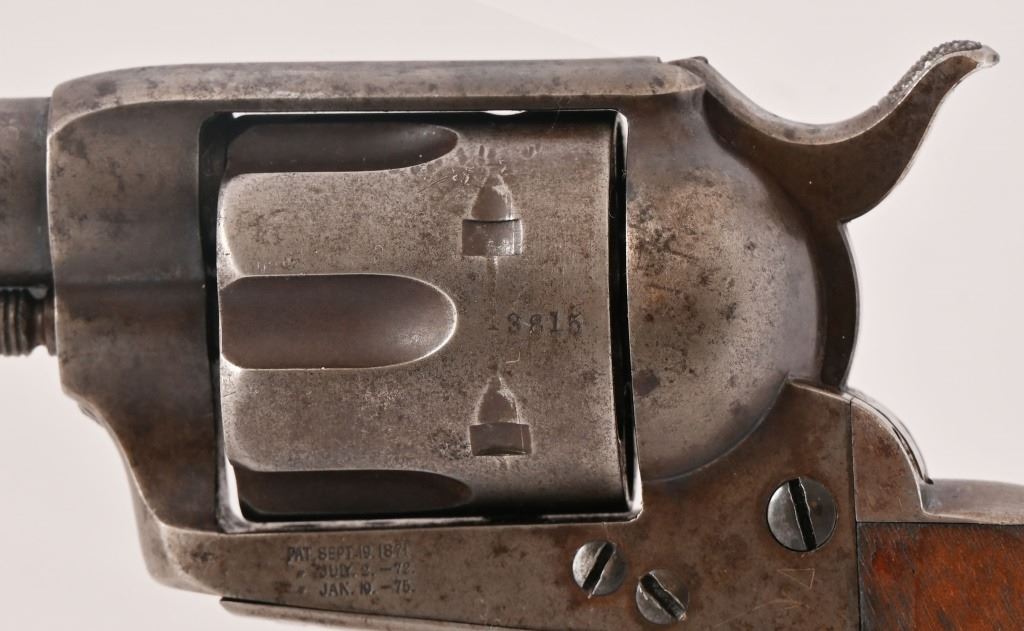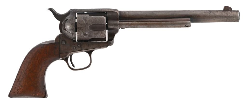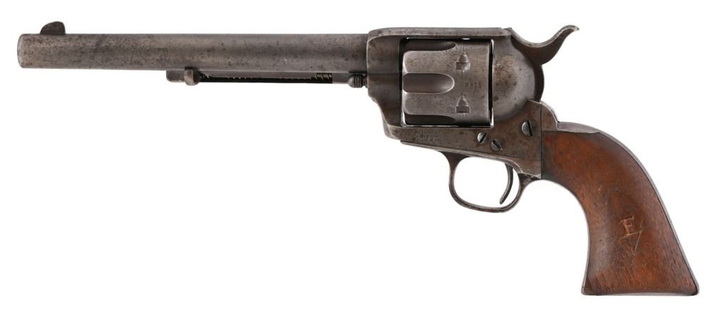 S/N 63815, manufactured in 1881. Blue finish, 7.5" barrel. Working condition. One piece wood grips have F with triangle carved on one side. Factory letter shows shipped to Hartley and Graham, New York, Nov 4, 1881. Antique.
