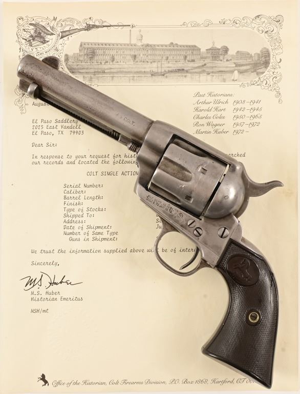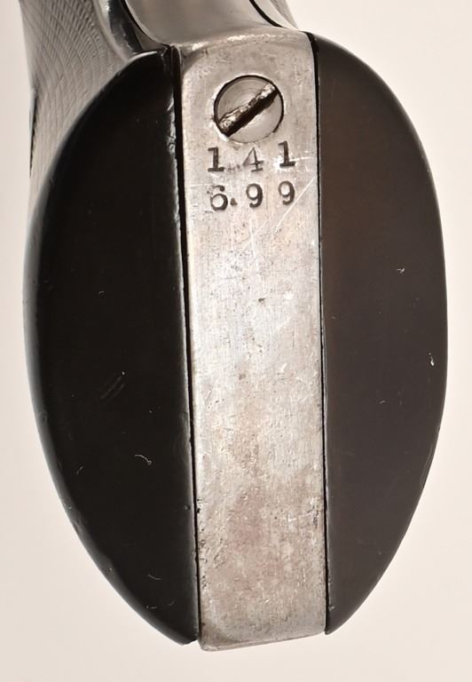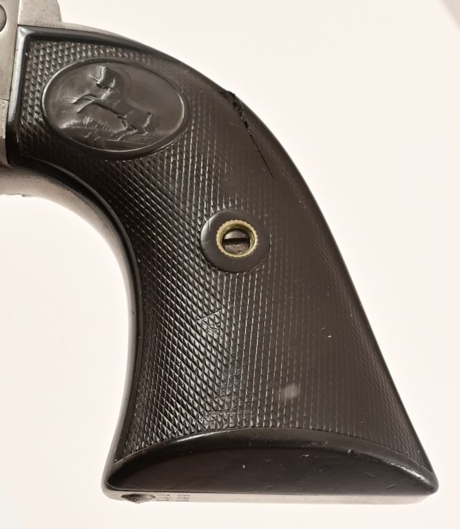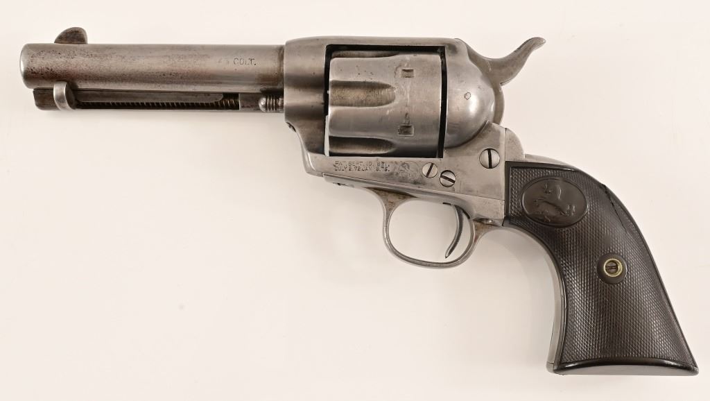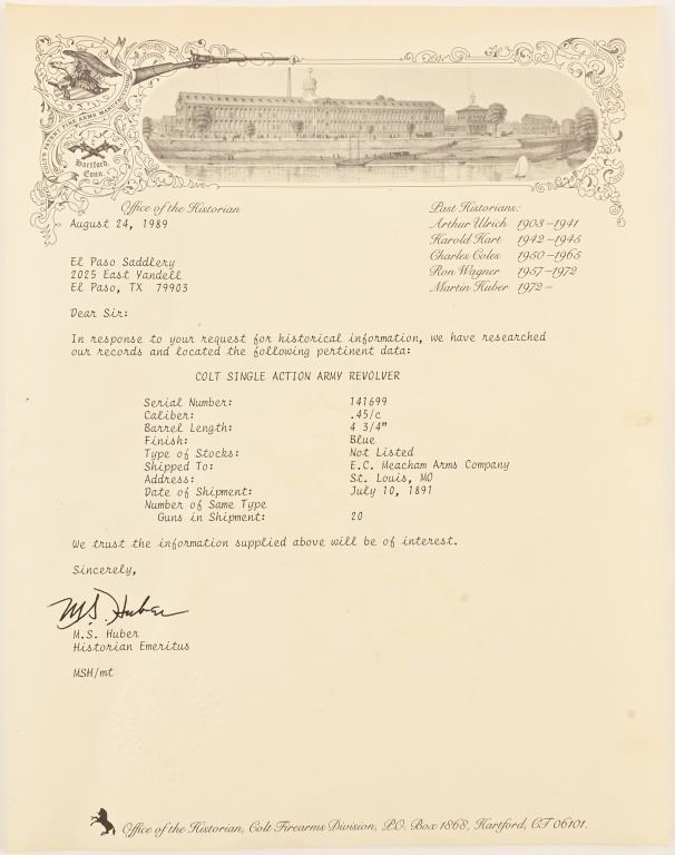 S/N 141699. 4.75" barrel, rampant colt checkered rubber grips. Factory letter shows part of 20 gun shipment to E.C. Meacham Arms Company, St. Louis, Missouri on July 10, 1891. Bore has some pitting with smoothing or rifling, however action is nice and cylinder tight.