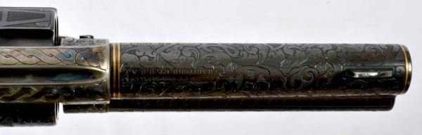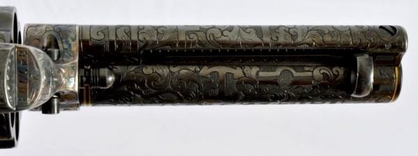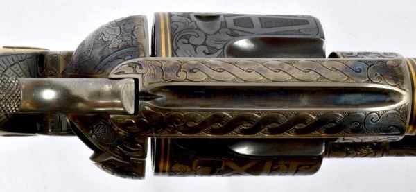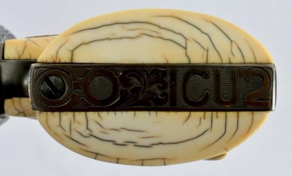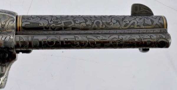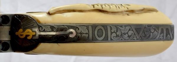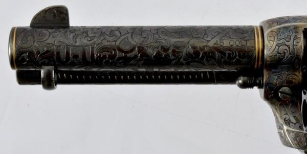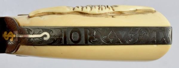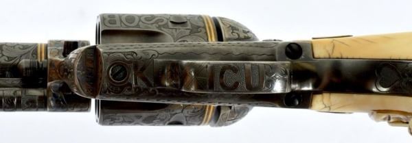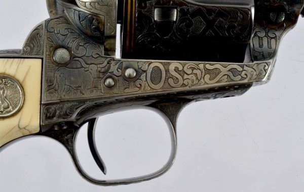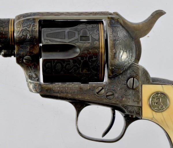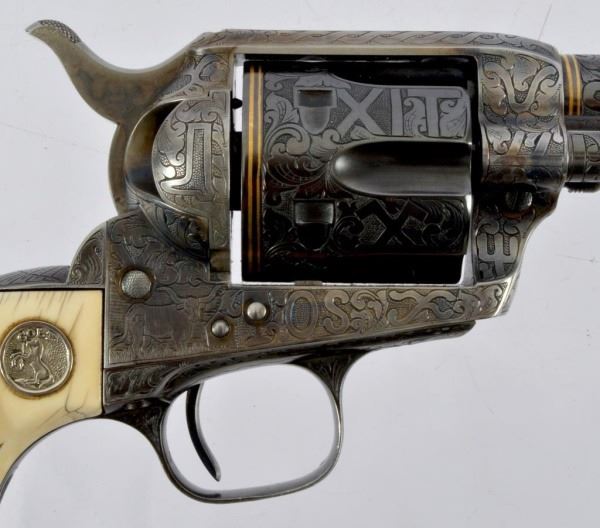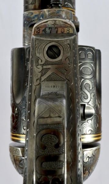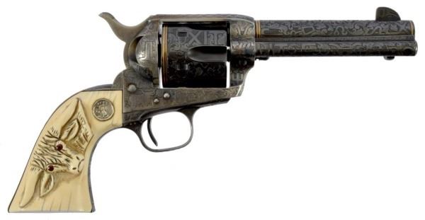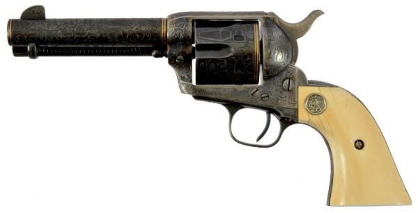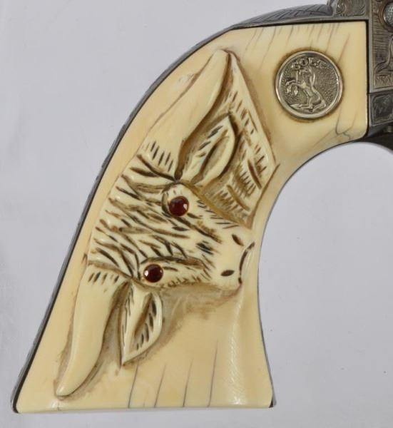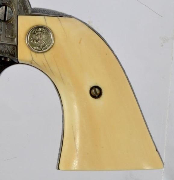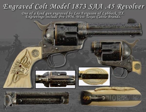 * Ivory grips. With factory letter and letter from engraver Leo Ferguson, Lubbock, TX detailing each brand engraved on the gun. Factory letter states shipped to Los Angeles in 1925. Serial no. 347708