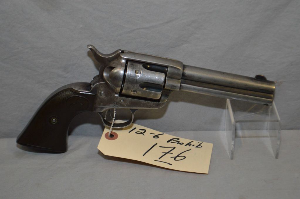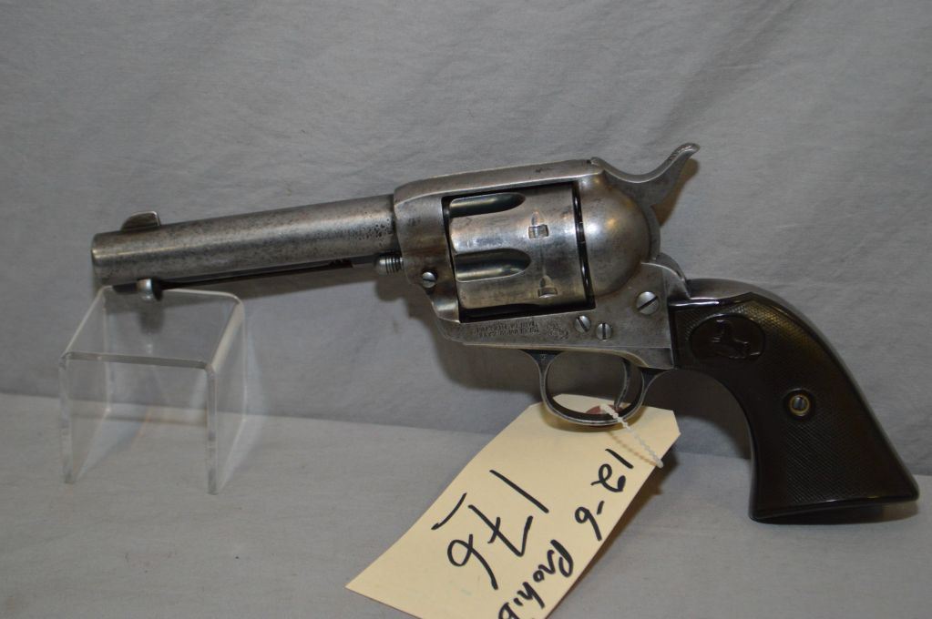 Colt Model 1873 Single Action Army First Generation .32 WCF Cal 6 Shot Revolver w/ 121 mm bbl [ matching numbers, traces of blue fading to grey, more in carry areas, good worn checkered Colt insignia grips, case colored receiver turned silver and flaking, Colt Two Line Hartford Address, Circa 1905 ] Ser # 271524 12-6 Prohib EXPECT DELAYS IN TRANSFER Cert # 13607179