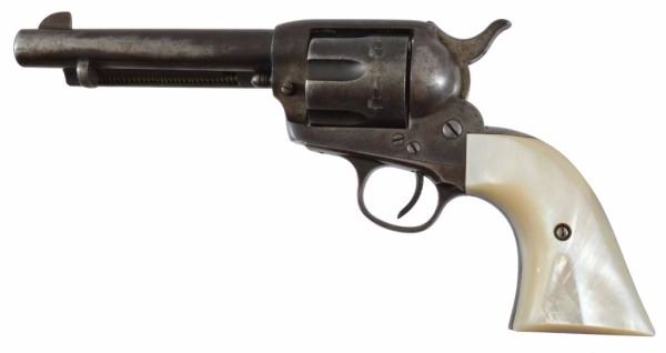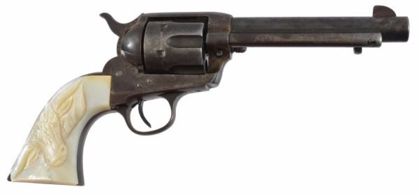 * Serial no. 324169 .38-40 5 1/2" barrel. in good working condition with traces of blue over a brown patina. mother of pearl carved steer head grips.