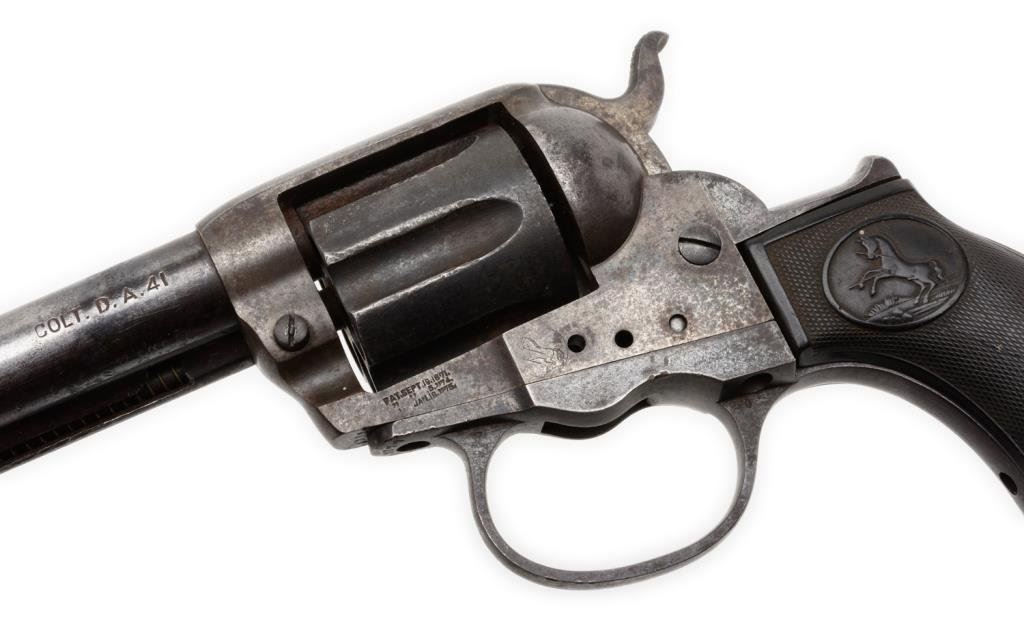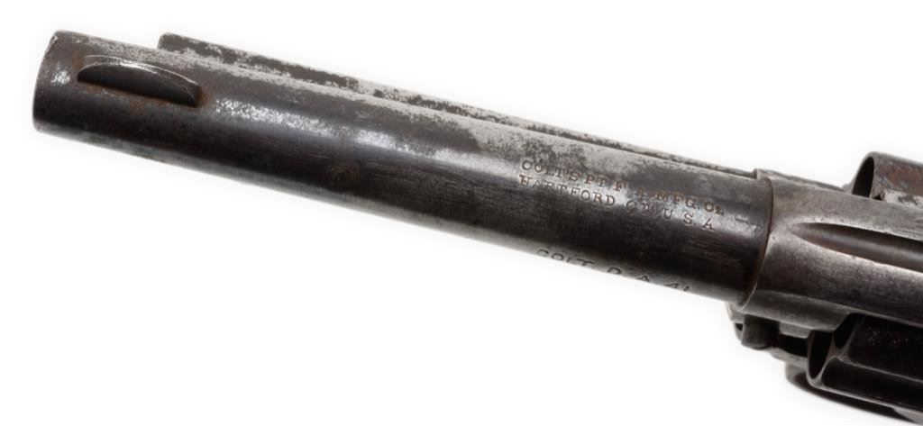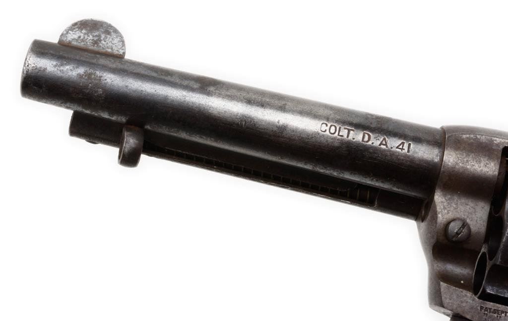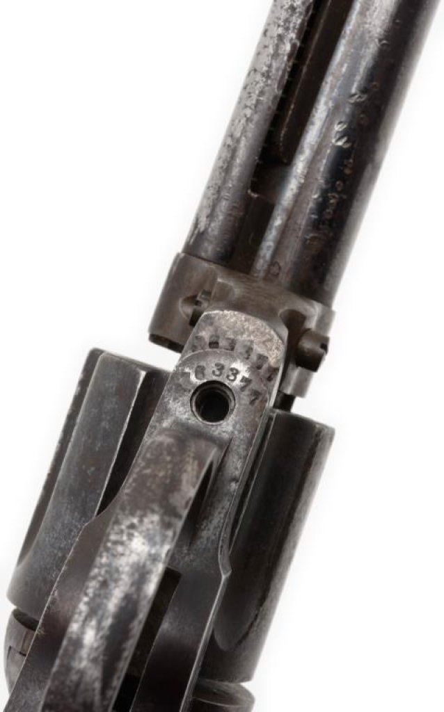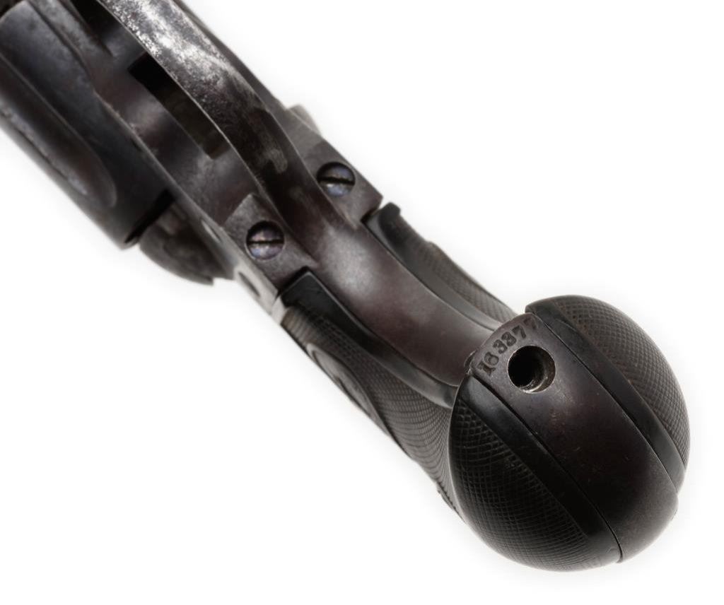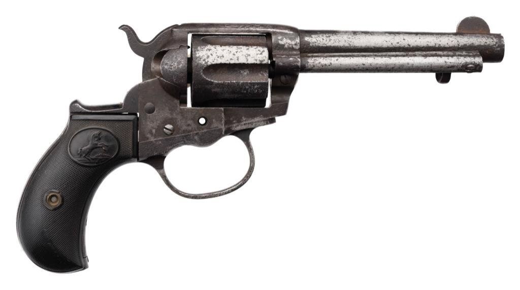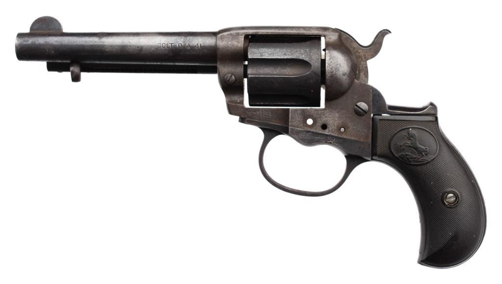 Colt Model 1877 DA “Thunderer” revolver, 4.5” barrel, S/N 163377, blued and case hardened finish, checkered black rubber grips; matching visible numbers, traces of blue on barrel, some internal parts missing; a candidate for restoration or for use as parts. Est.: $75-$150.