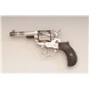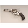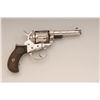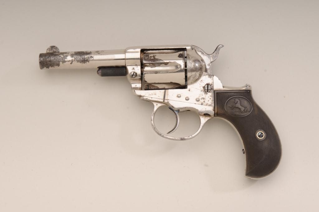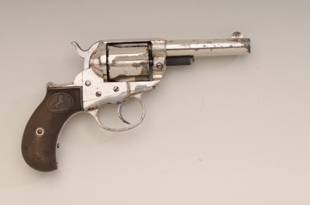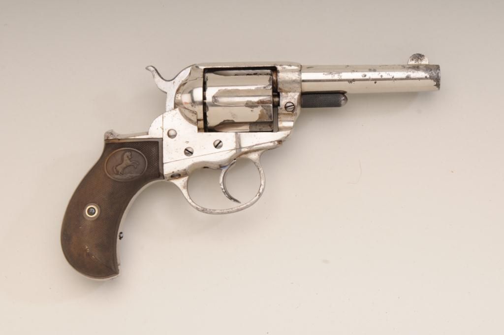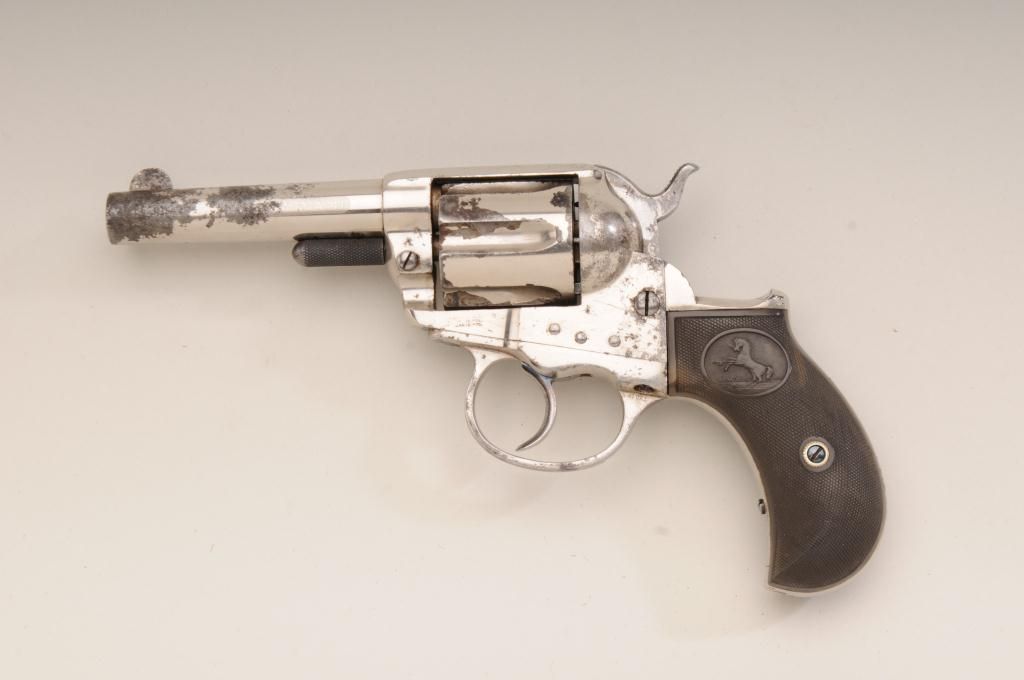 Colt Model 1877 DA "Thunderer" ejectorless revolver, .41 cal., 3-1/2" barrel, nickel finish, checkered hard rubber grips, #45032. This gun is in overall very good + condition showing approx. 65% original nickel finish,60% original etched panel scene on left side of barrel, majority of finish loss and spots of pitting confined to left muzzle side of barrel, some flaking of finish to areas of cylinder front; good action at time ofdescription, matching visible numbers, good bore and grips. Est.: $700-$1,400.