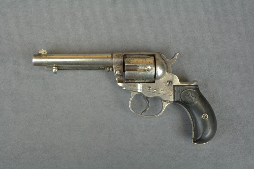 Colt Model 1877 DA Thunderer revolver, .41 cal., 4-1/2” barrel, nickel finish, checkered hard rubber grips, #49741. This gun is in overall very good to fine condition showing approx. 65% original finish with most of theetched barrel scene remaining, good bore, very good action at time of description, good markings, worn but complete grips with some scattered scratches from carry, bore is fair. Est.: $600-$1,200.