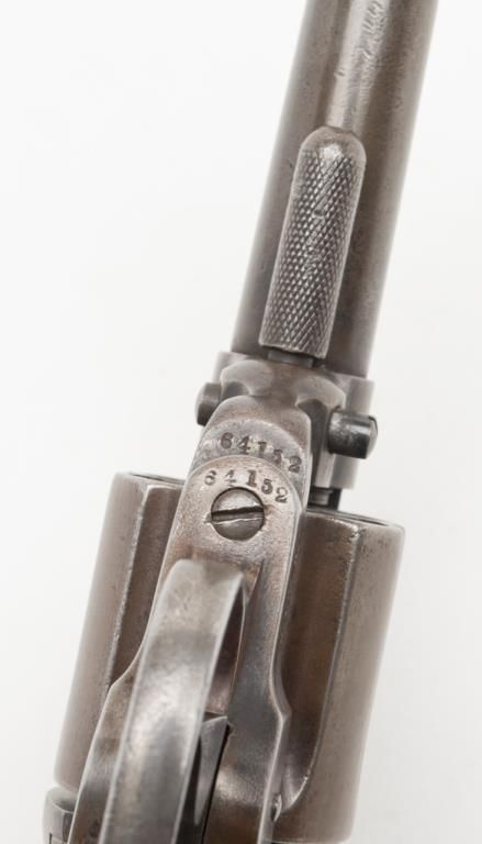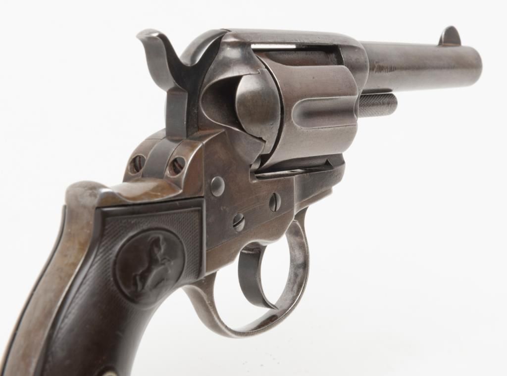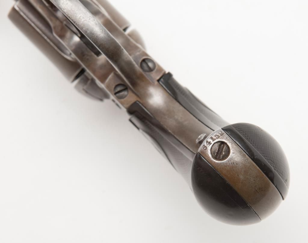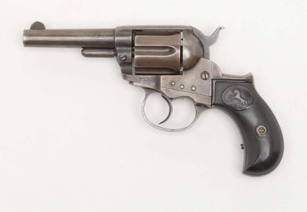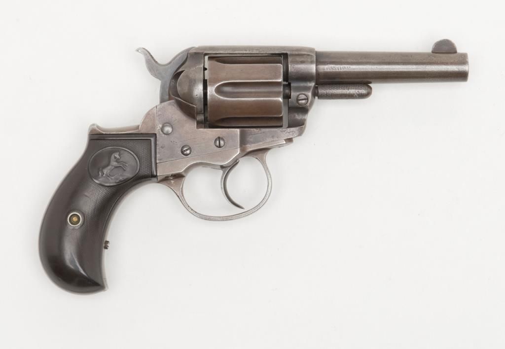 Colt Model 1877 DA ejectorless revolver, .38 cal., 3-1/2” barrel, blue and case hardened finish, hard rubber grips, #64152 in overall good condition showing a dark patina, working action at time of description, good markings, worn butcomplete grips. (Antique). Est.: $250-$450.
